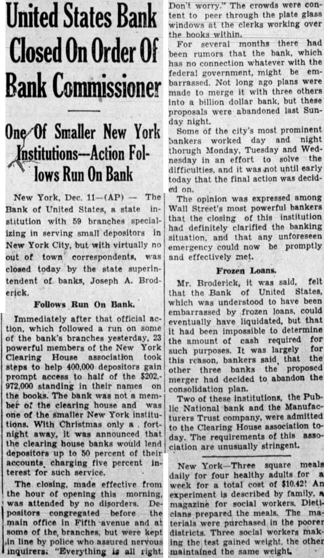 Don't worry.' The crowds were content to peer through the plate glass windows at the clerks working over the books within. For several months there had been rumors that the bank, which has no connection whatever with the federal government, might be embarrassed. Not long ago plans were made to merge it with three others into a billion dollar bank, but these proposals were abandoned last Sunday night. Some of the city's most prominent bankers worked day and night thorugh Monday, Tuesday and Wednesday in an effort to solve the difficulties, and it was not until early today that the final action was decided on. The opinion was expressed among Wall Street's most powerful bankers that the closing of this institution had definitely clarified the banking situation, and that any unforeseen emergency could now be promptly and effectively met.