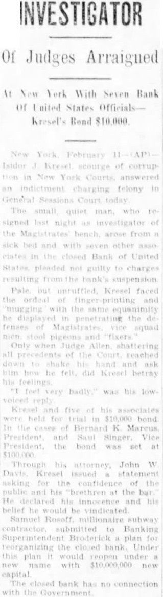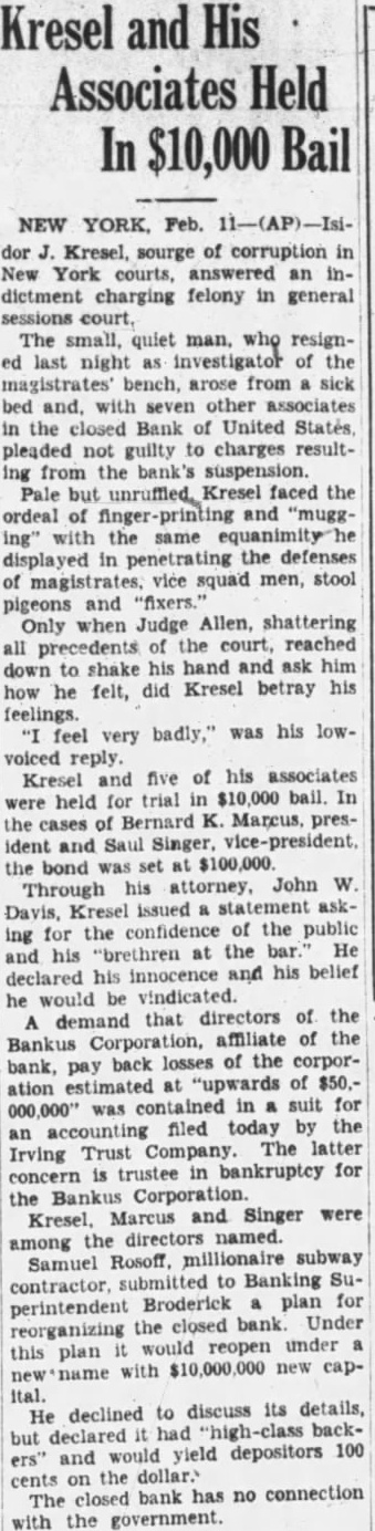 NEW Feb. dor Kresel, sourge corruption York courts, answered an dictment charging felony in general sessions The small, quiet man. resigned last night investigator of the bench, arose from sick bed and, with seven other associates in the closed Bank of United States pleaded not guilty charges resulting the bank's suspension. but unruffled Kresel faced the ordeal of and "mugging" same equanimity in the defenses of vice squad men, stool pigeons and Only when Judge Allen, shattering all of the court, reached down shake his hand and ask him did Kresel betray his how felt, badly," was his very voiced reply. Kresel five of his associates $10,000 In held trial the cases Bernard Marcus, president and Singer, the bond John W. Through Davis, issued askthe confidence of the public ing for his "brethren at the bar. He declared innocence and his belief would vindicated. he demand directors of the affiliate of the pay back losses of the corporof $50.was in suit for filed by the The latter Irving Trust concern is in for the Bankus Kresel, Marcus Singer were among named. Samuel Rosoff. millionaire subway contractor, submitted Banking SuBroderick plan perintendent closed bank. Under reorganizing the reopen under this plan capital. discuss its details, declined to He had backbut depositors 100 and would yield ers" the dollar. cents has no connection closed bank with the government.