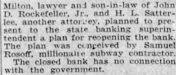 Milton, lawyer and of John D. Rockefeller, Jr., and H. Satteranother planned to sent to the state banking plan for reopening the bank The plan conceived by Samuel Rosoff, millionaire subway The closed bank has no connection with the government.