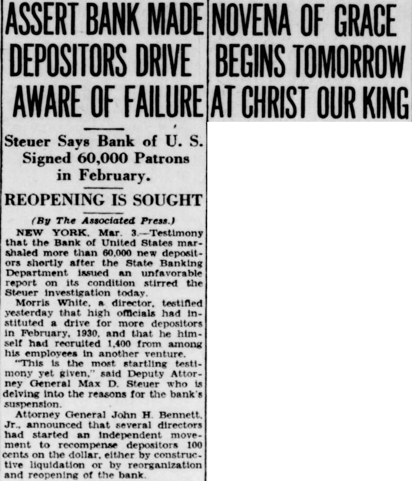 New York. Mar. mony that Bank States marshaled more than depositors shortly after the State Banking Department issued an unfavorable report on its condition stirred the Steuer investigation yesterday that high officials had instituted drive mcre depositors in February, 1930 and that he self had recruited 1,400 among his in venture. "This is the most startling mony said Deputy torney General Max D. Steuer is delving into the reasons for bank's suspension. Attorney General John H. that several had started an independent to depositors 160 cents on the dollar, either constructive liquidation or by and reopening of the bank.
