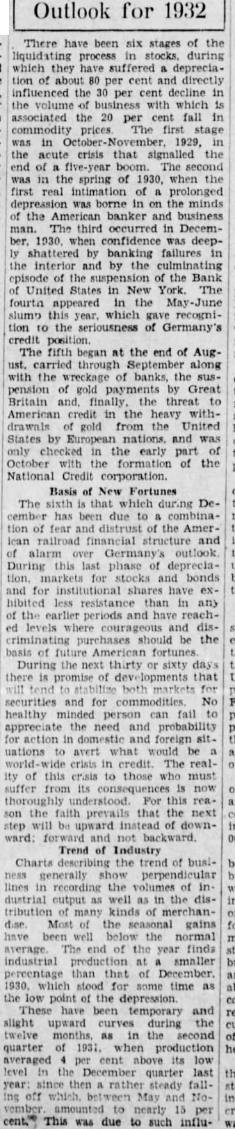 There been six stages of the process stocks, during which depreciaand directly influenced the per decline the associated the cent fall was the the end the spring 1930, when real intimation of prolonged was in the minds the banker and business occurred December, 1930. when confidence was shattered banking failures the and culminating episode the Bank United States New appeared slump this which recognition seriousness of Germany's credit The at the end of Augthe banks, the susBritain threat American withdrawnls gold United States nations. and was checked the early part October the formation the National Credit corporation. Basis of New Fortunes The which Dehas been due to tion of fear and of the Amerrailroad structure and alarm Germany's outlook During last phase depreciation for and bonds and for institutional hibited less resistance any the periods and disbe the of the thirty sixty that securities and commodities No healthy can fail appreciate the and foreign nations what would crisis in credit. reality of crisis those who must suffer from this son the that the Trend of Industry Charts the recording the of dustrial output the tribution kinds Most gains normal average. the finds industrial smaller percentage that which stood for some the low point the depression These been temporary and slight upward curves during the twelve in the second quarter when production averaged per its low level the last year fallMay per This was due to such influ-
