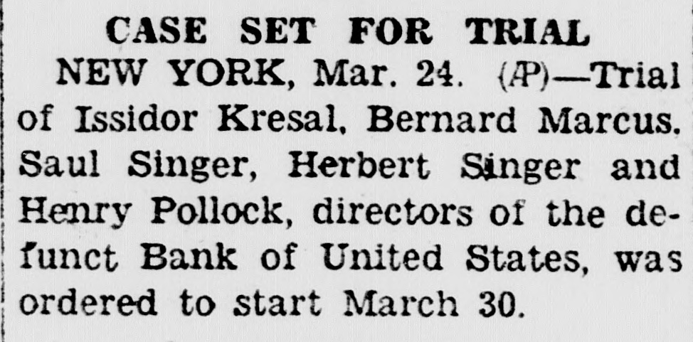 CASE SET FOR TRIAL NEW YORK, Mar. 24. (AP)-Trial of Issidor Kresal, Bernard Marcus. Saul Singer, Herbert Singer and Henry Pollock, directors of the defunct Bank of United States, was ordered to start March 30.