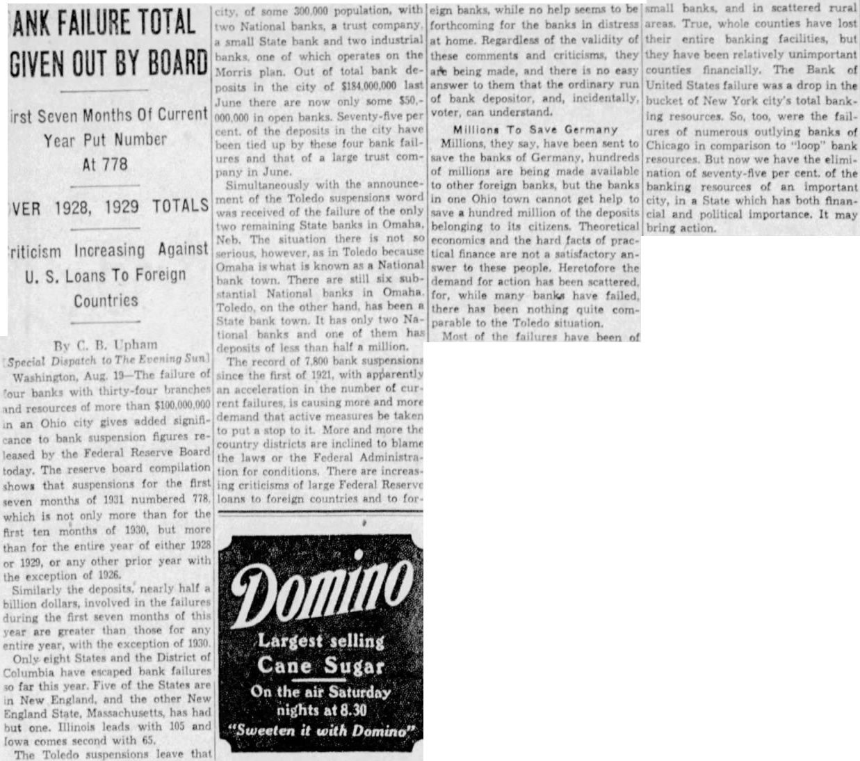 By C. B. Upham deposits less than half million. Special Dispatch to The Evening Sun] The record of 7,800 bank suspensions Washington, Aug. 19-The failure of since the first of 1921, with apparently an acceleration in the number of curfour banks with thirty-four branches rent failures, is causing more and more and resources of more than $100,000,000 demand that active measures be taken in an Ohio city gives added signifito put stop to it. More and more the cance to bank suspension figures recountry districts are inclined to blame leased by the Federal Reserve Board the laws or the Federal Administratoday. The reserve board compilation tion for conditions. There are increasshows that suspensions for the first ing criticisms of large Federal Reserve seven months of 1931 numbered 778. loans to foreign countries and to for which is not only more than for the first ten months of 1930, but more than for the entire year of either 1928 or 1929, or any other prior year with the exception of 1926. Similarly the deposits, nearly half Domino billion dollars. involved in the failures during the first seven months of this year are greater than those for any Largest selling entire year, with the exception of 1930 Only eight States and the District of Cane Sugar Columbia have escaped bank failures so far this year. Five of the States are On the air Saturday in New England, and the other New nights at 8.30 England State, Massachusetts, has had but one. Illinois leads with 105 and "Sweeten it with Domino" Iowa comes second with 65. The Toledo suspensions leave that city, of some 300,000 population, with two National banks, a trust company small State bank and two industrial banks, one of which operates on the Morris plan. Out of total bank deposits in the city of $184,000,000 last June there are now only some $50.000,000 in open banks. per cent. of the deposits in the city have been tied up by these four bank failures and that of large trust company in June. Simultaneously with the announcement of the Toledo suspensions word was received of the failure of the only two remaining State banks in Omaha, Neb. The situation there is not serious, however, as in Toledo because Omaha what is known National bank town. There are still six substantial National banks in Omaha Toledo, on the other hand. has been State bank town. It has only two National banks and one of them has eign banks, while no help seems to be forthcoming for the banks in distress at home. Regardless of the validity of these comments and criticisms, they are being made, and there is no easy answer to them that the ordinary run of bank depositor, and, incidentally, voter, can understand. Millions To Save Germany Millions, they say, have been sent to save the banks of Germany, hundreds of millions are being made available to other foreign banks, but the banks in one Ohio town cannot get help to save hundred million of the deposits belonging to its citizens. Theoretical economics and the hard facts of practical finance are not satisfactory answer to these people. Heretofore the demand for action has been scattered. for, while many banks have failed. there has been nothing quite comparable to the Toledo situation. Most of the failures have been of small banks, and in scattered rural areas. True, whole counties have lost their entire banking facilities, but they have been relatively unimportant counties financially. The Bank of United States failure was drop in the bucket of New York city's total banking resources. So, too, were the failures of numerous outlying banks of Chicago in comparison to "loop" bank resources. But now we have the elimination of seventy-five per cent. of the banking resources of an important city, in State which has both financial and political importance. It may bring action.