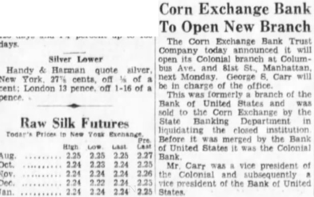 The Corn Exchange Bank Trust Company today announced will open its Colonial branch Columbus Ave. 81st St., Manhattan next Monday George 8. Carr will be in charge of the office This was formerly branch of the Bank of United States was sold to Corn Exchange by the Raw Silk Futures State Banking Department in liquidating the closed institution Prices York Exchange Before merged by the Bank High Last of United States it was the Colonial 2.25 2.25 2.25 2.27 Mr Carr was vice president of the Colonial and 2.24 vice president of the Bank of United 2.24 2.24 2.24 2.25 States
