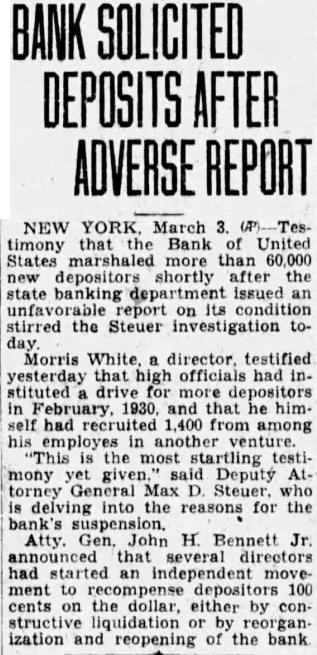 NEW YORK. March 3. Testimony that Bank of United States marshaled more than 60,000 depositors shortly after the banking issued report on its condition stirred the Steuer investigation today. Morris White, director. testified yesterday that high officials had instituted drive more depositors in 1930 and that he self had 1,400 from among his the most startling testimony said Deputy torney General Max D. who is delving into the reasons for the Atty. Gen. H. Bennett Jr. announced that an movement to recompense depositor 100 cents on the dollar, either by constructive liquidation or by reorganization and reopening of the bank