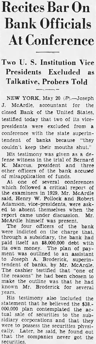 NEW YORK, May McArdle, accountant for the closed Bank United States, testified today that two of its vicepresidents were excluded from conference with the state superintendent banks because couldn't keep their mouths shut." testimony witness Bernard and three the bank accused of funds. At conferences which followed report the 1929 Mr. McArdle Henry Pollock and Robert Adamson, absent themselves when the report discussion. Mr. McArdle was present. The four the bank the that through subsidiary, the bank had debt with money The ment outlined assistant Joseph superinby Mr. The cashier testified that "one the chosen make the that he had known Broderick for several His testimony included the statement that the contemplated the tual securities the sidiary and they possess he found that the companies never got the securities.