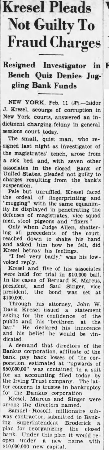 NEW YORK, Feb. Kresel, scourge of corruption in New York courts, answered an dictment charging felony in general court today. The small, who quiet man, signed last night investigator the magistrates' from arose sick bed and, seven other associates in closed Bank United States. pleaded not guilty charges resulting from the bank's suspension. Pale Kresel faced ordeal fingerprinting "mugging" with the same equanimdisplayed penetrating the defenses magistrates, vice squad stool pigeons Only Judge Allen, shatterprecedents court, reached down shake hand asked felt, did Kresel betray feelings very badly,' was his voiced reply. Kresel and five of his associates were held trial $10,000 bail. cases Bernard Marcus, president, Saul Singer, president, bond set Through attorney, John Kresel issued statement asking for the confidence the public his "brethren the declared innocence his belief would be dicated. demand that directors of the Bankus affiliate of the bank. back losses of the poration. "upwards $50,000,00" filed today the Irving Trust The concern trustee bankruptcy for the Bankus corporation. Kresel, Marcus Singer among directors named. Samuel Rosoff. millionaire subcontractor, BankSuperintendent Broderick reorganizing closed bank. Under this plan it would open under name with $10,000,000 new capital.