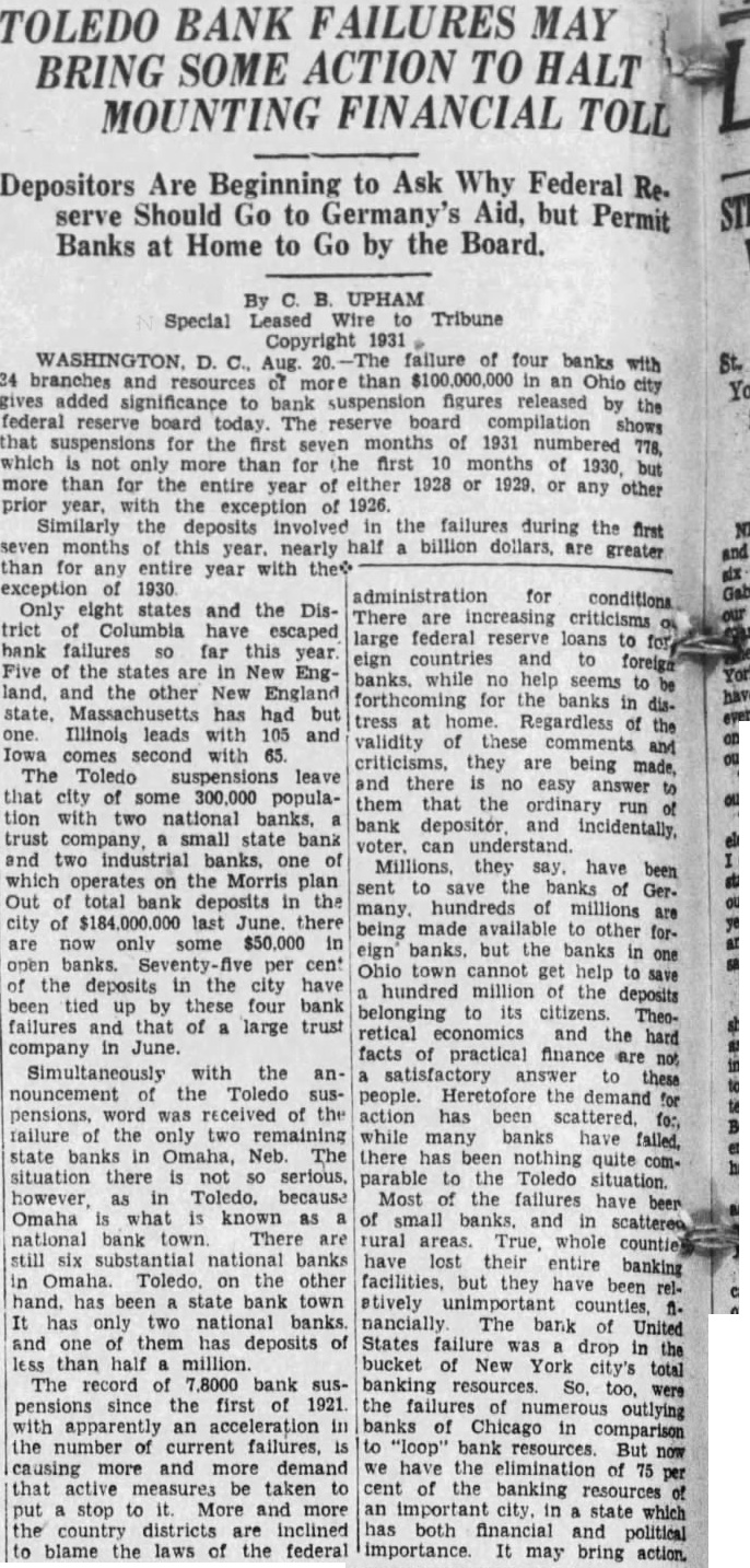 TOLEDO BANK FAILURES MAY BRING SOME ACTION TO HALT MOUNTING FINANCIAL TOLL exception of 1930 Only eight states and the trict Columbia have escaped failures far this the states are in New Engand the other New England state, Massachusetts has had but one. Illinois leads with 105 and Iowa comes second with 65. The Toledo suspensions leave that city of some population with two national banks, trust company. small state bank and two industrial banks, one which on the Morris plan Out of total deposits in the city of $184,000.000 last there are now only some $50,000 per cent the deposits in the city have been tied up by these four bank failures and that of large trust company in June. Simultaneously with the nouncement the Toledo suspensions, word was received of the failure of the only two remaining state banks in Omaha, Neb The situation there not so as Toledo, because Omaha what known national bank town There are substantial national banks Toledo the other hand. has been state bank town has only two national banks and one of them has deposits than half million The record of bank sussince the first of an acceleration in the number of current failures. causing more and more demand that be taken put stop More and more the country districts are inclined to blame the laws of the federal administration for conditions There are increasing criticisms large federal reserve loans to eign countries and to banks. while no help seems forthcoming for the banks tress at home. Regardless the validity of comments and criticisms, they are being made, and there easy answer them that the ordinary run bank depositor and voter. understand. they have been sent to save the banks of Germany. hundreds of millions being made available to other foreign but the banks Ohio town cannot get help hundred million the deposits belonging to its citizens. Theoretical economics and the hard facts practical finance are not satisfactory answer these people. Heretofore the demand action has been scattered. while many banks have failed. there has been nothing quite parable the Toledo situation. Most of the failures have small banks. and rural areas. whole have their entire banking facilities, but they have been atively unimportant counties, nancially The bank of United States failure was drop bucket of New York city's total banking So were the failures of outlying banks of Chicago in comparison to bank But now have the elimination of per cent of the banking an state which has both financial and political importance may bring action.