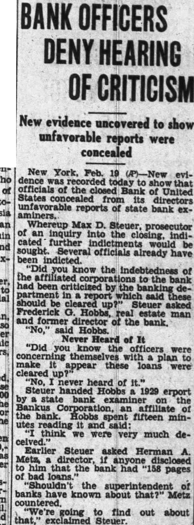 New York, Feb. evidence recorded today officials of the closed Bank United States from its directors reports state bank exWhereup Max Steuer, inquiry the indicated further be sought. Several officials already have indicted. "Did you know the indebtedness of the the bank by the desaid these should asked Frederick Hobbs, estate man and former director of the bank. Hobbs. Never Heard "Did know the officers plan make these loans were cleared never heard of Steuer Hobbs 1929 erport state bank examiner an affiliate the bank. Hobbs spent fifteen minreading think we were very much deEarlier Steuer asked Herman Metz, director, that the bank had pages "Shouldn't the superintendent banks known about that?" Metz countered. going to find out about exclaimed Steuer.