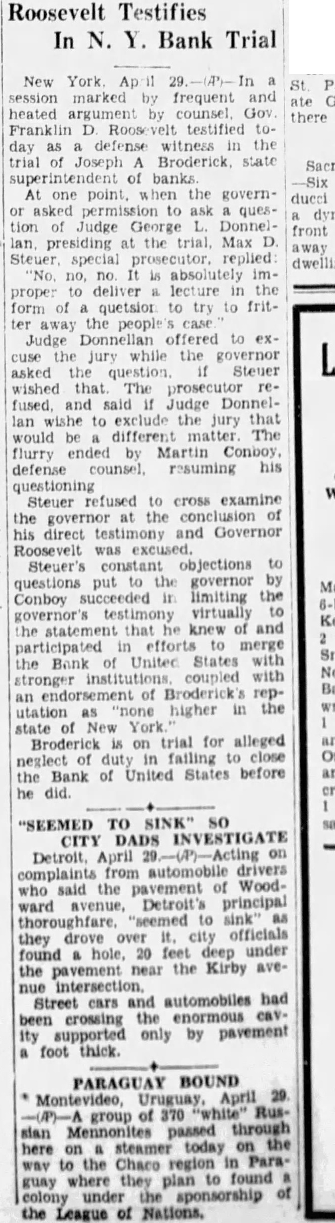 New York Ap il In session marked by frequent and heated argument by counsel Gov Franklin D. testified today as defense witness in the trial of Joseph A Broderick state superintendent of banks At one point, when the governor asked permission to ask question Judge George L. Donnellan, presiding at the trial, Max D. Steuer special prosecutor, replied "No. no, no. It is absolutely improper to deliver lecture in the form of quetsion to try to fritter away the people's case Judge Donnellan offered to excuse the jury while the governor asked the question if Steuer wished that The prosecutor refused. and said if Judge Donnellan wishe to exclude the jury that would be different matter The flurry ended by Martin Conboy, defense counsel, resuming his questioning Steuer refused to cross examine the governor at the conclusion of his direct testimony and Governor Roosevelt was excused. Steuer's constant objections to questions put to the governor by Conboy succeeded in limiting the governor's testimony virtually to the statement that he knew of and participated in efforts to merge the Bank of United States with stronger institutions. coupled with an endorsement of Broderick's reputation as "none higher in the state of New York. Broderick is on trial for alleged neglect of duty in failing to close the Bank of United States before he did.