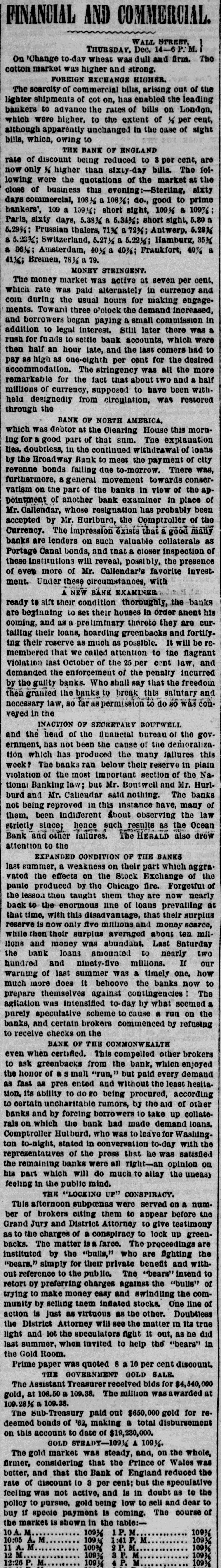 AND COMMERCIAL. WALL STREET, THURSDAY. Dec. 14-6 P:M. On 'Change to-day wheat was dull and firm. The cotton market was higher and strong. FOREIGN EXCHANGE HIGHER The scarcity of commercial bilts, arising out of the lighter shipments of cot on, has enabled the leading bankers to advance the rates of bills on London, which were higher, to the extent of 1/2 per cent, although apparently unchanged in the case of sight bills, which, owing to THE BANK OF ENGLAND rate of discount being reduced to 8 per cent, are now only % higher than sixty-day bills. The 101lowing were the quotations of the market at the close of business this evening:-Sterling sixty days commercial, 108 1/2 a 108%; do., good to prime bankers', 109 a 10914; short sight, 109 % a 1097 Paris, sixty days, 5.383/4 a 5.34% short sight, 5.80 a 5.29%: Prussian thalers, 71% a 72 1/2; Antwerp. 5.28% 5.23% Switzerland, 5.27 1/6 a 5.221; Hamburg, 3534 a 86% Amsterdam, 401/2 a 40%; Fraukfort, 40% a 41); Bremen, 783/2 79. MONEY STRINGENT. The money market was active at seven per cent, which rate was paid alternately in currency and coin during the usual hours for making engagements. Toward three o'clock the demand increased, and borrowers began paying a small commission in addition to legal interest. Still later there was a rush for funds to settle bank accounts, which were then half an hour late, and the last comers had to pay as high as one-eighth per cent for the desired accommodation. The stringency was all the more remarkable for the fact that about two and a half millions or currency, supposed to have been withheld designedly from circulation, was restored through the BANK OF NORTH AMERICA. which was debtor at the Clearing House this morning for a good part of that sum. The explanation lies. doubtless, in the continued withdrawal of loans by the Broadway Bank to meet the payment of city revenue bonds falling due to-morrow. There was, furthermore. a general movement towards conservatism on the parc of the banks in view of the ap. Dointment of another bank examiner in place of Mr. Callendar, whose resignation has probably been accepted by Mr. Hurlbura, the Comptroller of the Currency. The Impression exists that a good many banks are lenders on such valuable collaterals as Portage Canal bonds, and that a closer inspection of these Institutions will reveal, possibly. the presence of even more of Mr. Callendar's favorite investment. Under these circumstances, with A NEW BANK EXAMINER ready to stit their condition thoroughly, the banks are beginning to set their houses in order anent his coming, and as a preliminary thereto they are curtailing their loans, hoarding greenbacks and fortifying their reserve as much as possible. It will be remembered that we called attention to the flagrant violation last October of the 25 per cent law, and demanded the enforcement of the penalty incurred by the guilty banks. Who shall say that the freedom then granted the banks to break this salutary and necessary law, so far as permission to do 80 was conveyed in the INACTION OF SECRETARY BOUTWELL and the head of the financial bureau of the government, has not been the cause of the demoralization which has produced the many failures this week? The banks ran below their reserve in plain violation of the most important section of the Na. tional Banking law; but Mr. Boutwell and Mr. Hurlburd and Mr. Caliendar said nothing. The banks not being reproved in this instance have, many of them, been indifferent About observing the law strictly since; hence such results as the Ocean Bank and other failures. The HERALD also drew attention to the EXPANDED CONDITION OF THE BANKS last summer, a weakness on their part which aggra. vated the effects on the Stock Exchange of the panic produced by the Chicago fire. Forgetful of the lesso.r thou taught them they are now nearly back to the enormous line of loans prevailing at that time, with this disadvantage, that their surplus reserve is now only five millions and money scarce, while then their surplus averaged about ten millions and money was abundant. Last Saturday the bank loans amounted to nearly two hundred and ninety-five millions. If our warning of last summer was a timely one, how much more does it behoove the banks now to prepare themselves against contingencies ! The agitation was intensified to-day by what seemed a purely speculative scheme to cause a run on the banks, and certain brokers commenced by refusing to receive checks on the BANK OF THE COMMONWEALTH even when certified. This compelled other brokers to ask greenbacks from the bank. which enjoyed the honor of a mall "run," but paid every demand as fast as pres ented and without the least hesitation. its ability to do 20 being procured, according to certain uncharitable rumors, by the aid of other banks and by forcing borrowers to take up collaterals on which the bank bad made demand loans. Comptroller Hulburd. who was to leave for Washington to-night, stated in conversation to-day with the representatives of the press that he was satisfied the remaining banks were all right-an opinion on his part which will do much to allay the uneasy feeling in the public mind. THE "LOCKING UP" CONSPIRACY. This afternoon subpoenas were served on a number of brokers citing them to appear before the Grand Jury and District Attorney to give testimony as to the charges of a conspiracy to lock up greenbacks. The matter is a farce. The proceedings are instituted by the "bulls," who are fighting the "bears." simply for their private benefit and without reference to the public. The "bears" intend to retory by preferring charges against the "bulls" of trying to make money easy and swindling the community by selling tnem infated stocks. One line of action is just as virtuous as the other. Doubtless the District Attorney will see the matter in its true light and let the speculators fight it out, as ne did last summer, when invited to help the "bears" in the Gold Room. Prime paper was q