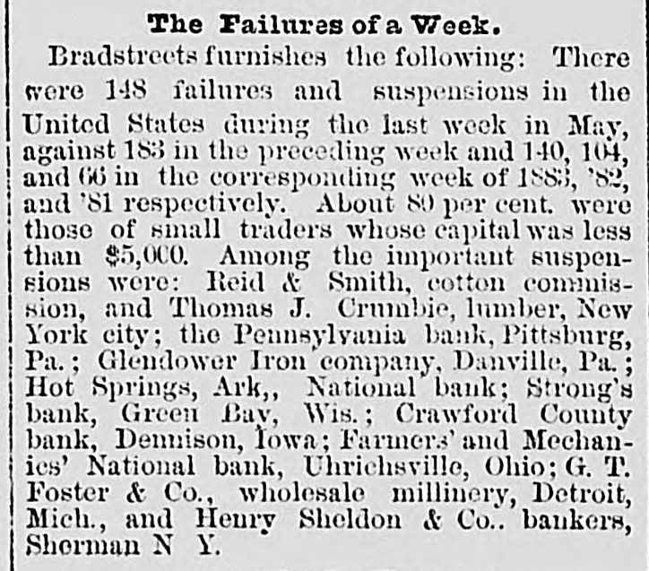 About 80 per cent. were those of small traders whose capital was less than $5,000. Among the important suspensions were Reid & Smith, cotton commission, and Thomas J. Crombie, lumber, New York city; the Penn Bank. Pittsburg, Pa.: Glendower Iron Company. Danville, Pa.: Hot Springs (Ark.) National Bank; Strong's Bank, Green Bay, Wis.; Crawford County Bank. Denison, Ia.; Farmers' and Mechanics' National Bank, Uhrichsville, Ohio: G. T. Foster & Co., wholesale millinery, Detroit, Mich., and Henry Sheldon & Co., bankers. Sherman, N. Y. In the principal trades they were as follows: General stores. 18; grocers, 11; liquors, 11; banks, 8; drugs, 8; millinery. 8; tobacco and cigars, 8; shoes, 7; clothing, 6; fancy goods, 5; hardware and agricultural implements, 5; jewelry, 5; dry goods, 4; furniture. 4; hotels and restaurants, 4; grain and flour. 3; harness, 3; lumber. etc., 3; butchers, 3; commission. 3; bankers, 2: bakers, 2; carriages, 2; men's furnishing goods, 2; produce and provisions, 2. ALABAMA. Farmsdate.-J. C. Brown & Co., general store, compromised. FLORIDA. Green Core Springs.-C. H. Moss. general store, failed and stock taken on two claims or $1,800. Kissimmee.-P. Y. Jennings & Co., general store, recently assigned, were attached. and the assignment, it is reported, was declared void. GEORGIA. Atlanta.-John H. James, banker. shows liabilities $506,000; nominal assets $656,000; actual assets $411,000. Of the assets $360,000 is in real estate, and efforts are being made to form a stock company of the depositors to hold the real estate. which is increasing in value. Stewart Brothers. shoes, failed. The stock is chattel mortgaged for $2,850. NORTH CAROLINA. Garysburg.-Jordon & Kee, general store, assigned. Liabilities estimated at $750; assets $1,000. TENNESSEE. Bellbuckle.-W. L. Garner, general store, failed. Liabilities $2,000: actual assets $1,200. Brownsville.-H. Orr, butcher and grocer, closed by attachment. Jackson.-W. H. Burnell & Co., wagon makers, assigned. Memphis.-H. G. Getchell & Co., pianos, assigned. Liabilities $6 000; assets $4,400. Rogersville.-John M. Carson, general store and grain, assigned.
