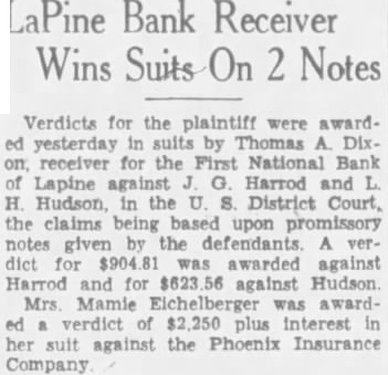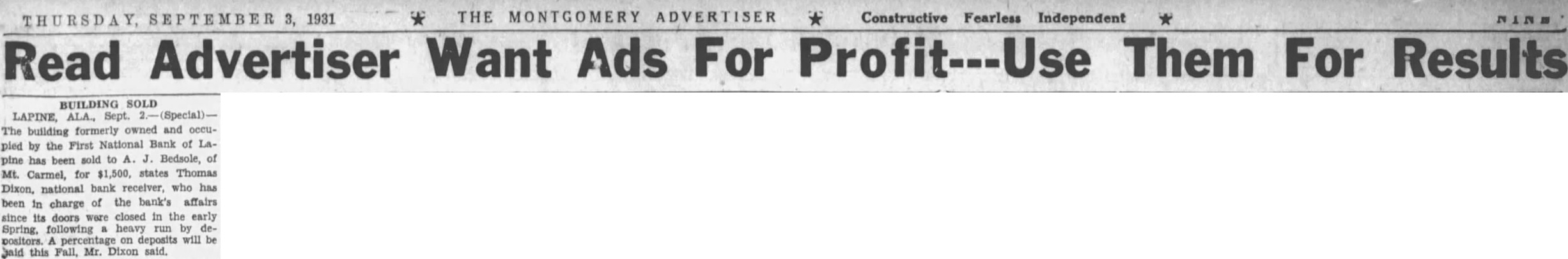 THE MONTGOMERY ADVERTISER * Constructive Fearless Independent THURSDAY, SEPTEMBER 3, 1931 Read Advertiser Want Ads For Profit--Use Them For Results BUILDING SOLD LAPINE, ALA., Sept. (Special)The building formerly owned and occupied by the First National Bank of Lapine has been sold to A. J. Bedsole, of Mt. Carmel, for $1,500, states Thomas Dixon, national bank receiver, who has been in charge of the bank's affairs since its doors were closed in the early Spring, following heavy run by depositors. percentage on deposits will be hald this Fall, Mr. Dixon said.