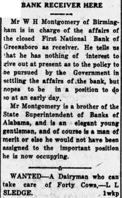 BANK RECEIVER HERE Mr W H Montgomery of Birming ham is in charge of the affairs of the closed First National Bank of Greensboro as receiver. He tells us that he has nothing of interest to give out at present as to the policy to be pursued by the Government in settling the affairs of the bank, but nopes to be in a position to do 30 at an early day. Mr Montgomery is a brother of the State Superintendent of Banks of Alabama, and is an elegant young gentleman, and of course is a man of merit or else he would not have been assigned to the important position he is now occupying. WANTED-A Dairyman who can take care of Forty Cows, L SLEDGE. 1wkp