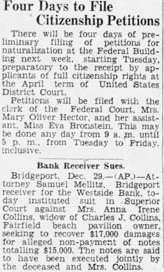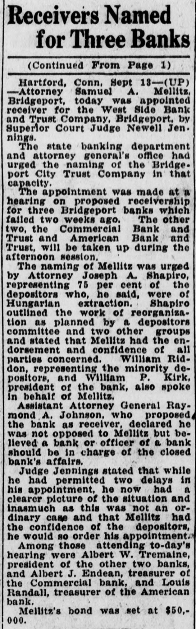 Receivers Named for Three Banks (Continued From Page 1) Hartford, Conn, Sept 13-(UP) -Attorney Samuel A. Mellitz, Bridgeport, today was appointed receiver for the West Side Bank and Trust Company, Bridgeport, by Superior Court Judge Newell Jen. nings. The state banking department and attorney general's office had urged the naming of the Bridgeport City Trust Company in that capacity. The appointment was made at a hearing on proposed receivership for three Bridgeport banks which failed two weeks ago. The other two, the Commercial Bank and Trust and American Bank and Trust, will be taken up during the afternoon session. The naming of Mellitz was urged by Attorney Joseph A. Shapiro, representing 75 per cent of the depositors who, he said, were of Hungarian extraction. Shapiro outlined the work of reorganization as planned by a depositors committee and two other groups and stated that Mellitz had the endorsement and confidence of all parties concerned. William Riddon, representing the minority depositors, and William P. Kirk, president of the bank, also spoke in behalf of Mellitz. Assistant Attorney General Raymond A. Johnson, who proposed, the bank as receiver, declared he was not opposed to Mellitz but believed a bank or officer of a bank should be in charge of the closed bank's affairs. Judge Jennings stated that while he had permitted two delays in his appointment, he now had a clearer picture of the situation and inasmuch as this was not an ordinary case and that Mellitz had the confidence of the depositors, he would so order his appointment. Among those attending to-day's hearing were Albert W. Tremaine, president of the other two banks, and Albert J. Endean, treasurer of the Commercial bank, and Louis Randall, treasurer of the American bank. Mellitz's bond was set at $50,000.