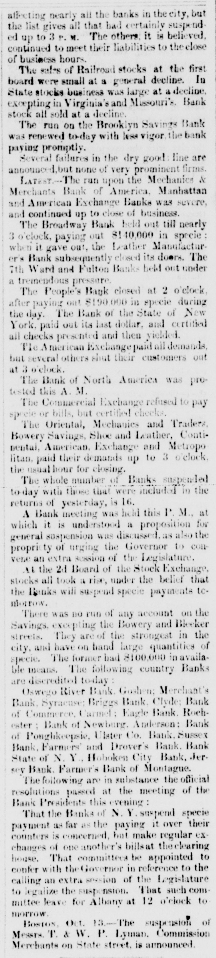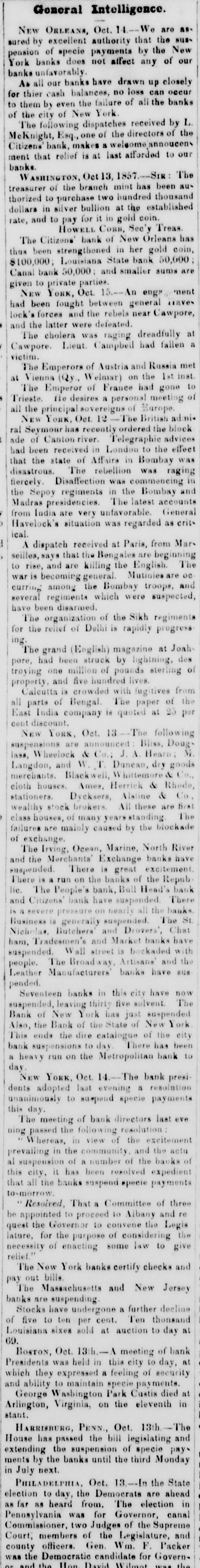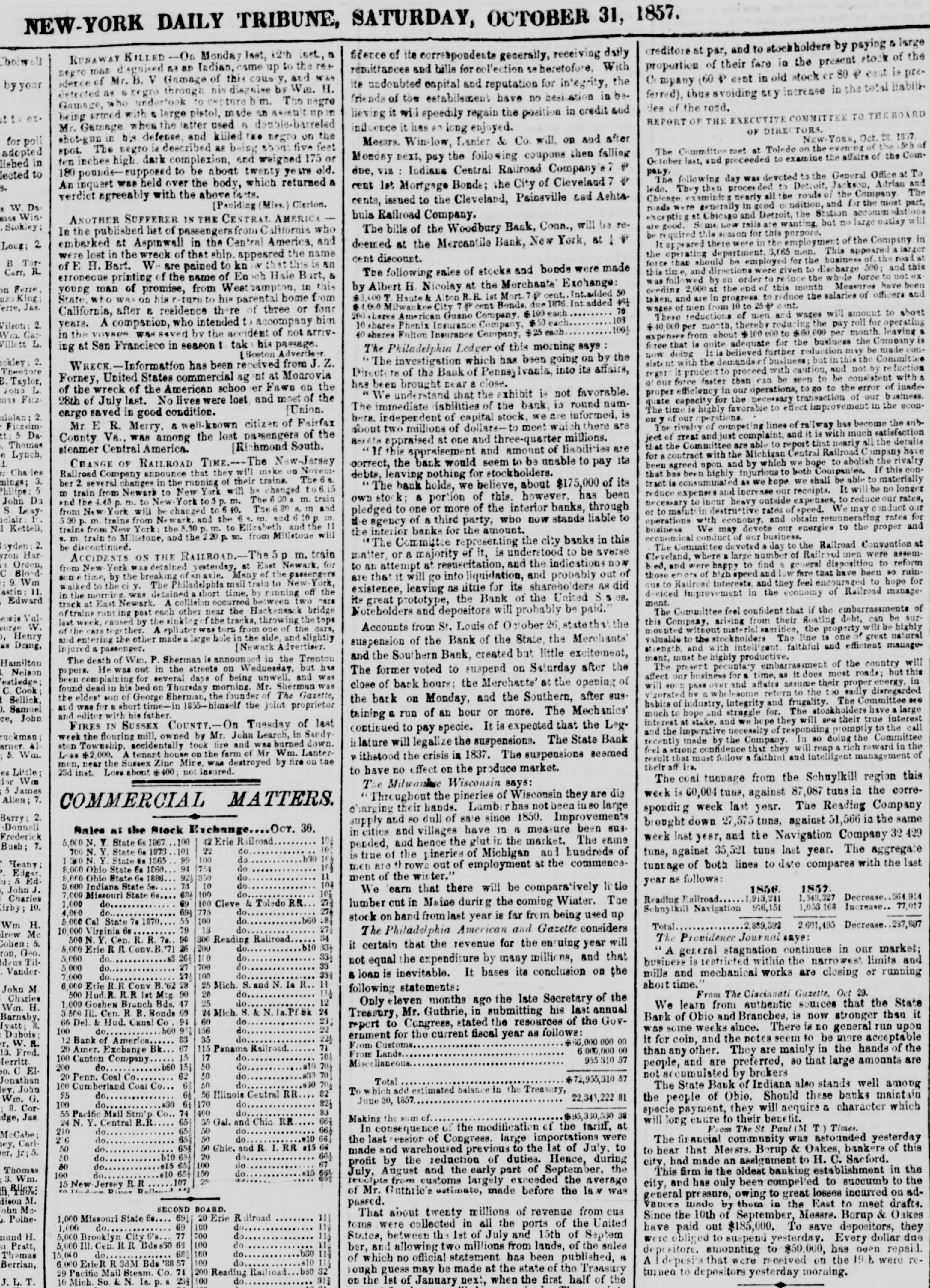 NEW-YORK DAILY TRIBUNE, SATURDAY, OCTOBER 31, 1857. creditors at par, and to stockholders by paying & large fidence of its correspondents generally, receiving daily RUNAWAY KILLED - Monday last, 12th inst, a Cholwell proportion of their fare in the present stock of the remittances and bills for collection heretofore, With pegro man sgnised an Indian, came up to the T63mpany (60 P sent in old stock or 80 P east is preiderce of Mr. B. V Gamage of this cous y, and was its undoubted capital and reputation for integrity, the by your detected as 6 pegro through his diagnise by Wm. H. ferred), thus avoiding any increase in the total Habili friends of the estabilsment have no hesitation in beGamage, who undertook to expture The negro siee of the road. lieving it will speedily regain the position in credit and being armed with & large pistol, made en assent up ex. REPORT OF THE EXECUTIVE COMMITTEE TO THE BOARD Mr. Gamage when the latter used B double-barreled influence it has 80 long enjoyed. OF DIREC NEW-YORK, Oct. 28, 1857. shot-gun in big defense, and killed the negro on the for poll Messrs. Winslow, Lanier & Co. will, on and after The Committee met at Toledo on the evening of the 5th of spot. The negro is described as being about five feet adopted Monday next, pay the following coupons then falling October last, and proceeded to examine the affairs of the Comten inches high, dark complexion, and weighed 175 or in due, V12 Indiana Central Railroad Company's P to 180 ponds-supposed to be about twenty years old. pany. The following day was devoted to the General Office at To An inquest was held over the body, which returned a cent let Mortgage Bonds; the City of Cleveland 7 P ledo. They then procee to Detroit, Jackson, Adrian and verdict agreeably with the above facts. Chicago, examinir nearly all the roads of the Company. The cents, issued to the Cleveland, Painsville sad Ashts[Paulding (Miss.) Clarion. DsW. roads were generally in good o ndition, and for the most part, Win. bula Railroad Company. excepting at Chicago and Detroit, the Station accomen detions ANOTHER SUFFERER IN THE CENTRAL AMERICA are good. me new rails are wanting, but no large outlay will Scokley; The bills of the Woodbury Bank, Conn., will be reIn the published liet of passengers from California who be required this season for this purpose. 2. deemed at the Mercantile Bank, New York, at 1 P embarked at Aspinwall in the Central America, and It appeared there were in the employment of the Company in Long; the operating department. 3,165 men. This appeared a larger were lost in the wreck of that ship. appeared the name cent discount. Torforce than should be employed for the business of. the road at B of E H. Bart. We are pained to kn W is an R. this time, and directions were given to discharge 500; and this Carr, The following sales of stocks and bonds were made erroneous printing of the name of En Hale Bart, & was followed by an order to reduce the whole force to not ex by Albert H. Nicolay at the Merchants' Exchange: Ferre, ceeding 2,000 at the end of this month Measures have been young man of promise, from West hampton, in this $3,000 T Haute & Alton R.R. 1st Mort. cent. Int.added 50 King; taken. and are in progress to reduce the salaries of officers and State, who WAS on his r-turn to his parental home from Jae. wages of men from 10 to 25 $ cent. $4,000 Milwaukee City 7 cent Bonds. due 1876. Int added 70 4st California, after & residence there of three or fone 200 absres American Guano Company, each These reductions of men and wages will amount to about 103 years. A companion, who intended accompany him 2. 10 shares Phenix Insurance Company, 50 each Vilson: $ 40,000 per month, thereby reducing the pay roll for operating 100} in the VOV869 was saved by the accident of not arrivCarWm. 40 shares Fulton Insurance Company, $25 each expenses from about 100 000 to $60 000 per month leaving a L. Villett force that is quite adequate for the business the Company is ing at San Francisco in season t tak his passage. The Philadelphia Ledger of this morning says now doing It is believed further reduction may be made con[Boston Advertiser. 2. The investigation which has been going on by the siste nt with the demands.of business; but in this the Committee WRECK-Information has been received from J. Z. Theedore regard it prudent to proceed with cantion, and not by luction Directors of the Bank of Pennsy Ivania, into its affairs, Forney, United States commercial ag nt at Monrovia of our force faster than can be seen to be consistent with a Taylor, has been brought near 8 close. of the wreck of the American school er Fawn on the L. John proper efficiency in our operations, to go to the error of inadeWe understand that the exhibit is not favorable. Fitzquate capacity for the necessary transaction of our usiness. 28th of July last. No lives were lost, and most of the The immediate isbilities of the bank, is round numThe time is highly favorable to effect improvement in the econ[Union. cargo saved in good condition. 2. ony of our operations. hers. independent of capital stock, we are informed, is Fitzsim. The rivalty of competing lines of railway has become the subMr. E R. Merry, & well-known citizen of Fairfax about two millions of dollars-to meet which there are 5 Dajeet of great and just complaint, and it is with much satisfaction County Va., was among the lost parsengers of the assets appraised at one and three-quarter millions. Thomas that the Committee are able to report that nearly all the details [Richmond South. steamer Central America. If this appraisement and amount of liabilities are Lynch, for B contract with the Michigan Central Railroad ompany have CHANGE OF RAILROAD New-Jersey correct, the bank would seem to be unable to pay its been agreed upon and by which we hope to abolish the rivalty les Cha that has been highly injurious to both Companies. If this conRailroad Company announce that they will make on Novemdebts, leaving nothi