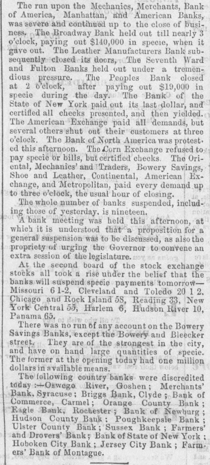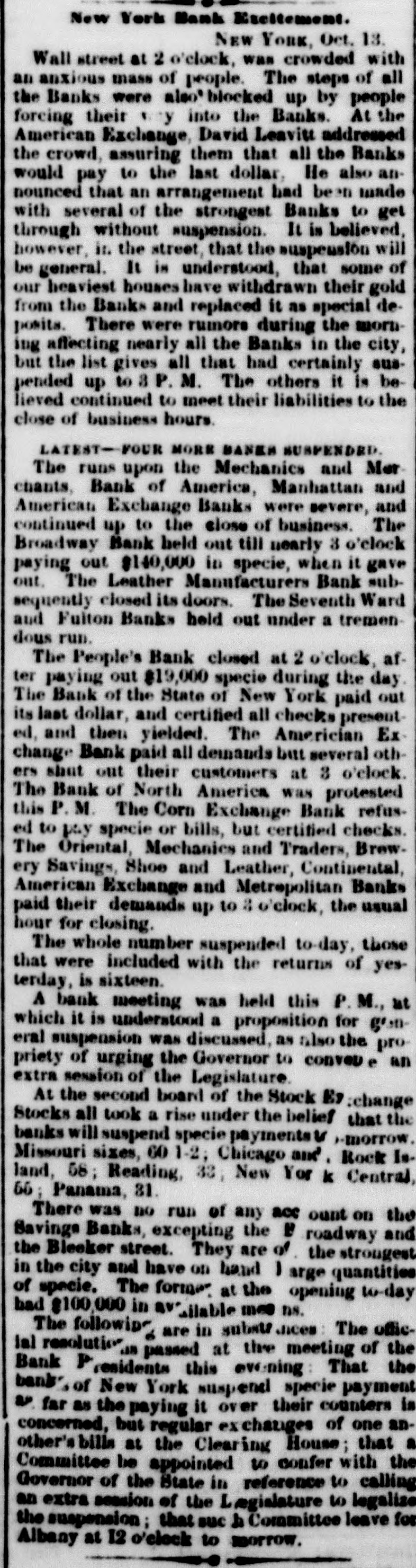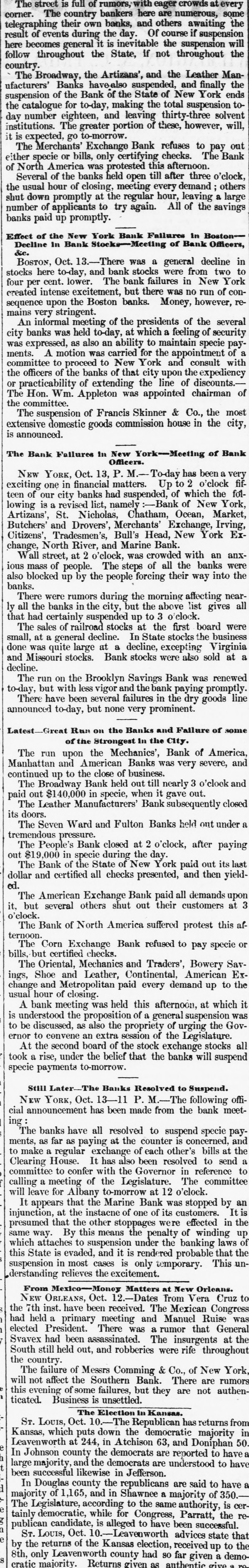 NEW-YORK DAILY TRIBUNE, SATURDAY, OCTOBER 31, 1857. creditors at par, and to stockholders by paying & large fidence of its correspondents generally, receiving daily RUNAWAY KILLED - Monday last, 12th inst, a Cholwell proportion of their fare in the present stock of the remittances and bills for collection heretofore, With pegro man sgnised an Indian, came up to the T63mpany (60 P sent in old stock or 80 P east is preiderce of Mr. B. V Gamage of this cous y, and was its undoubted capital and reputation for integrity, the by your detected as 6 pegro through his diagnise by Wm. H. ferred), thus avoiding any increase in the total Habili friends of the estabilsment have no hesitation in beGamage, who undertook to expture The negro siee of the road. lieving it will speedily regain the position in credit and being armed with & large pistol, made en assent up ex. REPORT OF THE EXECUTIVE COMMITTEE TO THE BOARD Mr. Gamage when the latter used B double-barreled influence it has 80 long enjoyed. OF DIREC NEW-YORK, Oct. 28, 1857. shot-gun in big defense, and killed the negro on the for poll Messrs. Winslow, Lanier & Co. will, on and after The Committee met at Toledo on the evening of the 5th of spot. The negro is described as being about five feet adopted Monday next, pay the following coupons then falling October last, and proceeded to examine the affairs of the Comten inches high, dark complexion, and weighed 175 or in due, V12 Indiana Central Railroad Company's P to 180 ponds-supposed to be about twenty years old. pany. The following day was devoted to the General Office at To An inquest was held over the body, which returned a cent let Mortgage Bonds; the City of Cleveland 7 P ledo. They then procee to Detroit, Jackson, Adrian and verdict agreeably with the above facts. Chicago, examinir nearly all the roads of the Company. The cents, issued to the Cleveland, Painsville sad Ashts[Paulding (Miss.) Clarion. DsW. roads were generally in good o ndition, and for the most part, Win. bula Railroad Company. excepting at Chicago and Detroit, the Station accomen detions ANOTHER SUFFERER IN THE CENTRAL AMERICA are good. me new rails are wanting, but no large outlay will Scokley; The bills of the Woodbury Bank, Conn., will be reIn the published liet of passengers from California who be required this season for this purpose. 2. deemed at the Mercantile Bank, New York, at 1 P embarked at Aspinwall in the Central America, and It appeared there were in the employment of the Company in Long; the operating department. 3,165 men. This appeared a larger were lost in the wreck of that ship. appeared the name cent discount. Torforce than should be employed for the business of. the road at B of E H. Bart. We are pained to kn W is an R. this time, and directions were given to discharge 500; and this Carr, The following sales of stocks and bonds were made erroneous printing of the name of En Hale Bart, & was followed by an order to reduce the whole force to not ex by Albert H. Nicolay at the Merchants' Exchange: Ferre, ceeding 2,000 at the end of this month Measures have been young man of promise, from West hampton, in this $3,000 T Haute & Alton R.R. 1st Mort. cent. Int.added 50 King; taken. and are in progress to reduce the salaries of officers and State, who WAS on his r-turn to his parental home from Jae. wages of men from 10 to 25 $ cent. $4,000 Milwaukee City 7 cent Bonds. due 1876. Int added 70 4st California, after & residence there of three or fone 200 absres American Guano Company, each These reductions of men and wages will amount to about 103 years. A companion, who intended accompany him 2. 10 shares Phenix Insurance Company, 50 each Vilson: $ 40,000 per month, thereby reducing the pay roll for operating 100} in the VOV869 was saved by the accident of not arrivCarWm. 40 shares Fulton Insurance Company, $25 each expenses from about 100 000 to $60 000 per month leaving a L. Villett force that is quite adequate for the business the Company is ing at San Francisco in season t tak his passage. The Philadelphia Ledger of this morning says now doing It is believed further reduction may be made con[Boston Advertiser. 2. The investigation which has been going on by the siste nt with the demands.of business; but in this the Committee WRECK-Information has been received from J. Z. Theedore regard it prudent to proceed with cantion, and not by luction Directors of the Bank of Pennsy Ivania, into its affairs, Forney, United States commercial ag nt at Monrovia of our force faster than can be seen to be consistent with a Taylor, has been brought near 8 close. of the wreck of the American school er Fawn on the L. John proper efficiency in our operations, to go to the error of inadeWe understand that the exhibit is not favorable. Fitzquate capacity for the necessary transaction of our usiness. 28th of July last. No lives were lost, and most of the The immediate isbilities of the bank, is round numThe time is highly favorable to effect improvement in the econ[Union. cargo saved in good condition. 2. ony of our operations. hers. independent of capital stock, we are informed, is Fitzsim. The rivalty of competing lines of railway has become the subMr. E R. Merry, & well-known citizen of Fairfax about two millions of dollars-to meet which there are 5 Dajeet of great and just complaint, and it is with much satisfaction County Va., was among the lost parsengers of the assets appraised at one and three-quarter millions. Thomas that the Committee are able to report that nearly all the details [Richmond South. steamer Central America. If this appraisement and amount of liabilities are Lynch, for B contract with the Michigan Central Railroad ompany have CHANGE OF RAILROAD New-Jersey correct, the bank would seem to be unable to pay its been agreed upon and by which we hope to abolish the rivalty les Cha that has been highly injurious to both Companies. If this conRailroad Company announce that they will make on Novemdebts, leaving nothi