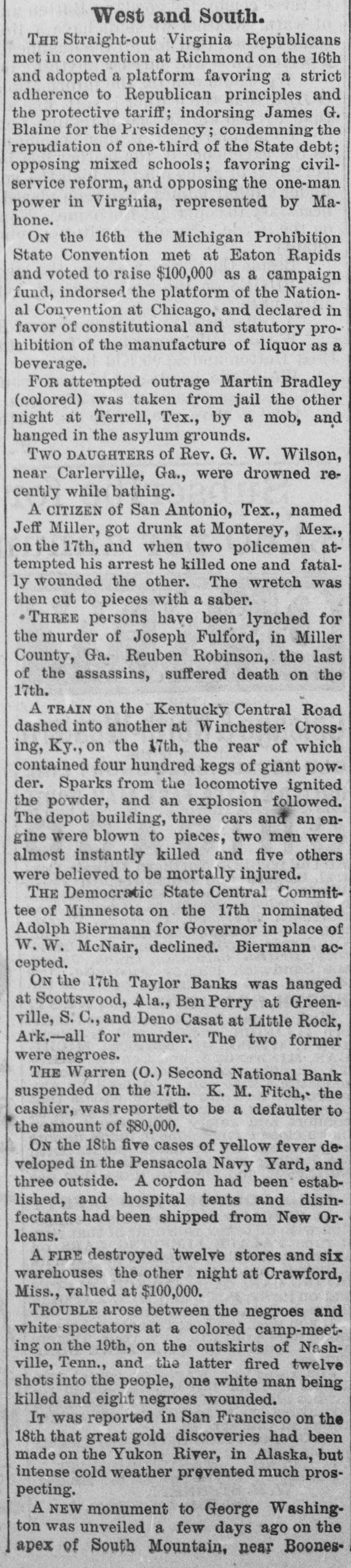 THE NEWS OF THE WEEK DEATH FROM FEAR OF HYDRO. PHOBIA. Royal Arch Versus Mari Master Masons-Giant Powder Blows 'I'wo Trains - A Machinist Finds 810,000. A man pained Perranit is reported to have died suddenly in Quebec of Canadian cholera. The United States Minister to Corea reports life there attended W ith many dis comforts and privations. The first rain that has visited Lynch burg, Virginia, for five weeks feli there yesterday week During the past six months 160 persons were killed and 401 injured in New York by railroad accidents. A number of the cigar dealers of St Louis have decided to keep their shops open on Sundays hereafter It la announced from Washington that the new postal notes will be ready for circuiation on the 31 of September next. Denuis Butler, aged 35. a resident of Mahauoy City, Pa., was killed by rail road car near Wilkesbarre, on Saturday night. The Second National Bank of Warran Ohio, suspended Friday evening. K. M Fitch, its cashier, is reported to be a de faulter for over $70,000. Right men, charged in Banks county Georgia, with Kn Klox outrages upon colored people, have been held in the United States Court. It is reported in Montreal that James MeShane, mem ber of Parliament, has contracted with the Frenth government to ship 150,000 cattle to France. J.C. McCauley, an officer in the New York Custom House, was attacked with heart disease and drowned Friday while bathing at Asbury Park. Three mills of the Arcadia Powder Company at Waverly, New York, biew up on Saturday, killing three men and injuring several others, three fatally A telegram from Troy says the Bennington Battle Monument Assouiation yesterday adopted a design submitted by Prefessor Weire. The monument is cost $100,000 John Tudor, living near Lexington Ky., discovered thiever in his meloa patch Friday night and fired pistol them, mortally wounding one of them, named Jackson. Consignments of woven wire spring beda and barbed wire made in Montreal were shipped Friday to New Zealand, being the first Canadian manufacturer Bent to that colony. The following murderers were hanged Friday Perry Cely, colored, Greenwich South Carolina Deno Casal, at Little Rock, and Tay lor Banks.color at Scottsboro, Alabama. Frederick Schoormel, a repairna. the Pennsylvania railroad felt asleep the railroad track near Middleto while drunk, ou Saturday night, and killed by a passing train. 35 feet A granite moaument, erected to the upon the club. Reuben Morse Thursday Salmi of ment $15,000 year, with The citizens Springs, York, offer for on Canandaigua Lake, between wher 19th. aud Courtney on Sep or 21st, the winner to take puree. The liabilities of Show & Boston stated by $7,509,803 assets the stated $302,290 The Royal Insurance Company Liverpool, last week took out for the erection in Chicago of a pine-s office building in ckson street, near new Chamber of Commerce, to $500,000. During a storm Sunday at Garden City, Long Island, flock shoup gath. ored under tree on the A. T. Stewart farm The tree was strack by lightning and 40 of the sheep were killed, 20 being severely injured. While boring for water at Tolono, 13 miles south of Chica vein of K88 struck at the depth of 130 feet. The has been conveyed by tubes dwelling where it is used for lighting, heating and cooking purposes. At Chautanqua Thursday, the Rev. II H. Moore of Wattsbury, lectured on Nihiliatic Philosophy, and the Rev. P. Henson of Chicago, made Piea for Old '--old folks, old culture and faith. Hewasenthusiastically applanded The Farmerr Bank of Richmond, Va. suspended Thursday. Its failure expected,as had been nsidered for some time. was established 1877, and had about $45, 000 deposit which, it is believed, will be paid in full Frank Blood, aged 26 years, was bitten by small dog, with which he was play ing, near Cobleskill, N. Y., on Thursday morning He became frantic from fell into such convulsions that three were unable to hold him. In the ing he died, solely from the effects fright. . Heavy rains fell Thursday throughou Virginia relieving the erops which suffered from the drought. The will corn crop that the tions are and much lighter than last sections only hall a crop of will be made. Official returns from 109 of the 11 counties of Kentocky give Proctor for governor, 43,571 majority. The counties expected maining eight sweil the figure to nearly 40,000, more than last year. The propor for a constitutional convention defeated. Notwithstanding a certain amount the from injury lead where resorts save the Manhattan Beach Oriental hotels. Edward J. Curry of Baltimor PA has bee committed jail, coarged th murde the to wife. reported she had died of heart disease, bn