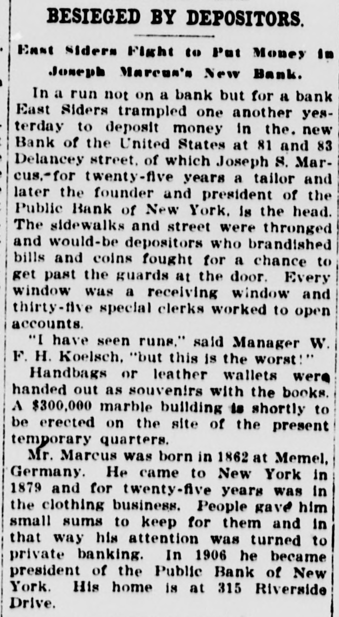 BESIEGED BY DEPOSITORS. East Siders Fight to Put Money in Joneph Marcus's New Bank. In a run not on a bank but for a bank East Siders trampled one another yesterday to deposit money in the. new Bank of the United States at 81 and 83 Delancey street, of which Joseph S. Marcus."for twenty-five years a tailor and later the founder and president of the Public Bank of New York. is the head. The sidewalks and street were thronged and would-be depositors who brandished bills and coins fought for a chance to get past the guards at the door. Every window was a receiving window and thirty-five special clerks worked to open accounts. "I have seen runs." said Manager W. F. H. Koelsch. "but this is the worst!" Handbags or leather wallets were handed out as souvenirs with the books. A $300,000 marble building is shortly to be erected on the site of the present temporary quarters. Mr. Marcus was born in 1862 at Memel, Germany. He came to New York in 1879 and for twenty-five years was in the clothing business. People gave him small sums to keep for them and in that way his attention was turned to private banking. In 1906 he became president of the Public Bank of New York. His home is at 315 Riverside Drive.