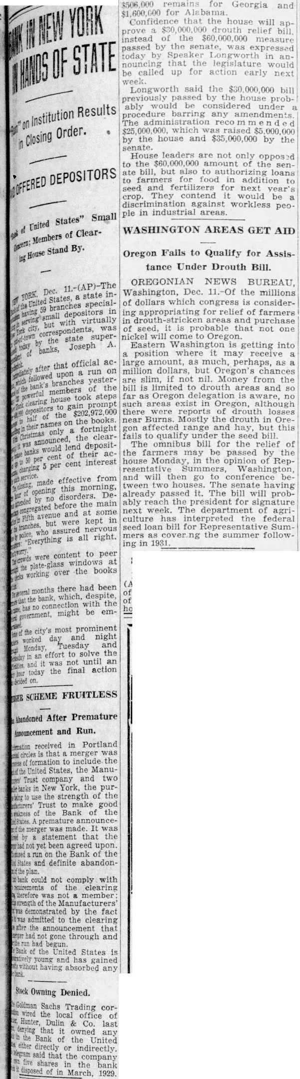 YORK STATE Institution Results Closing Order. DEPOSITORS Small States" United Clearof Members 11.-(AP)-The Dec. state inStates, specialbranches in depositors virtually with but was state superthe Joseph banks, official acthat after run on upon followed yesterbranches bank's of the members took steps house gain prompt depositors the the books. names on fortnight only Christmas the clearannounced, lend depositwould of their cent interest per cent effective from made this morning, disorders. Deno before the main and at some avenue kept in but were assured nervous who all right. "Everything is content to peer were windows at the books over working there had been despite, with the might be em- most prominent night day and Tuesday and effort to solve the not until an was the final action today SCHEME FRUITLESS Atandoned After Premature Amouncement and Run. received in Portland that merger was include the States, the ManuTrust company and two New the purthe strength of the Trust make good the Bank of the premature was made. It was that the been agreed upon. run the Bank of the States and definite abandon#bank could not comply with of the clearing therefore was not member: the T13 demonstrated by the fact admitted to the clearing the announcement that not gone through and begun. Bank the United States is young and has gained having absorbed any Owning Denied. Goldman Sachs Trading corthe local office Hunter, Dulin Co. last that owned any Bank of the United directly or indirectly. said that the company five shares in the bank disposed of March, 1929. $506,000 remains for Georgia and for bama Confidence that the house will approve $30,000,000 drouth relief bill. instead of the $60,000,000 measure passed by the senate, was expressed today by Speaker Longworth in announcing that the legislature would be called up for action early next Longworth said the bill previously passed by the house probably would be considered under procedure barring any amendments. The administration reco m m which was by the house and $35,000,000 by the senate. House leaders are not only opposed to the $60,000,000 amount of the senbill, but also to authorizing loans to farmers for food in addition to seed and fertilizers for next year's crop. They contend it would be discrimination against workless peo. ple in industrial areas. WASHINGTON AREAS GET AID Oregon Fails to Qualify for Assistance Under Drouth Bill. OREGONIAN NEWS BUREAU Washington, Dec. 11.-Of the millions of dollars which congress is considering appropriating for relief of farmers drouth-stricken areas and purchase of seed, it is probable that not one nickel will come to Oregon. Eastern Washington is getting into a position where it may receive large amount, as much, perhaps, as million dollars, but Oregon's chances are slim, not nil. Money from the bill is limited to drouth areas and so far as Oregon delegation is aware, no such areas exist in Oregon, although there were reports of drouth losses near Burns. Mostly the drouth in Oregon affected range and hay, but this fails to qualify under the seed bill The omnibus bill for the relief of the farmers may be passed by the house Monday, in the opinion of Representative Summers, Washington, and will then go to conference between two The senate having already passed it. The bill will probably reach the president for signature next week. The department of agriculture has interpreted the federal seed loan bill for Summers as cover ng the summer following in 1931