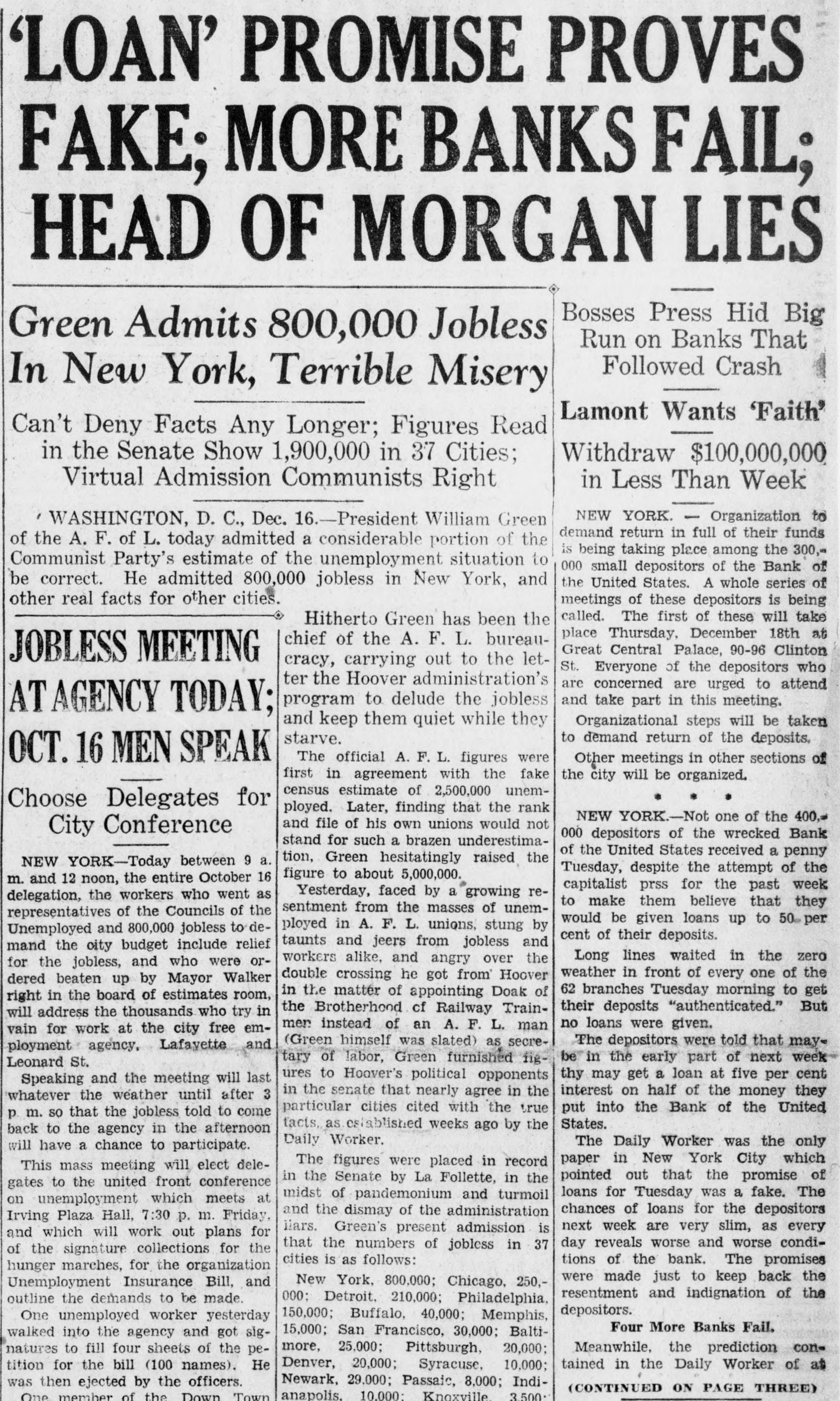 'LOAN' PROMISE PROVES FAKE; MORE BANKS FAIL; HEAD OF MORGAN LIES Bosses Press Hid Big Green Admits 800,000 Jobless Run on Banks That Followed Crash In New York, Terrible Misery Lamont Wants 'Faith' Can't Deny Facts Any Longer; Figures Read in the Senate Show 1,900,000 in 37 Cities; Withdraw $100,000,000 in Less Than Week Virtual Admission Communists Right NEW YORK. Organization to WASHINGTON, D. C., Dec. 16.-President William Green demand return in full of their funds of the A. F. of L. today admitted a considerable portion of the is being taking place among the 300,Communist Party's estimate of the unemployment situation to 000 small depositors of the Bank of be correct. He admitted 800,000 jobless in New York, and the United States. A whole series of other real facts for other cities. meetings of these depositors is being called. The first of these will take Hitherto Green has been the place Thursday, December 18th at chief of the A. F. L. bureauGreat Central Palace, 90-96 Clinton JOBLESS MEETING cracy, carrying out to the letSt. Everyone of the depositors who ter the Hoover administration's are concerned are urged to attend program to delude the jobless and take part in this meeting. AT AGENCY TODAY; and keep them quiet while they Organizational steps will be taken starve. to demand return of the deposits. OCT. 16 MEN SPEAK The official A. F. L. figures were Other meetings in other sections of first in agreement with the fake the city will be organized. census estimate of 2,500,000 unemChoose Delegates for ployed. Later, finding that the rank NEW YORK.-Not one of the 400,= and file of his own unions would not City Conference 000 depositors of the wrecked Bank stand for such a brazen underestimaof the United States received a penny tion, Green hesitatingly raised the NEW YORK-Today between 9 a. Tuesday, despite the attempt of the figure to about 5,000,000. m. and 12 noon, the entire October 16 capitalist prss for the past week Yesterday, faced by a growing redelegation, the workers who went as to make them believe that they sentment from the masses of unemrepresentatives of the Councils of the would be given loans up to 50th per ployed in A. F. L. unions, stung by Unemployed and 800,000 jobless to decent of their deposits. taunts and jeers from jobless and mand the city budget include relief Long lines waited in the zero workers alike, and angry over the for the jobless, and who were orweather in front of every one of the double crossing he got from Hoover dered beaten up by Mayor Walker 62 branches Tuesday morning to get in the matter of appointing Doak of right in the board of estimates room, their deposits "authenticated." But the Brotherhood cf Railway Trainwill address the thousands who try in no loans were given. men instead of an A. F. L. man vain for work at the city free em(Green himself was slated) as secreThe depositors were told that mayployment agency, Lafayette and be in the early part of next week tary of labor, Green furnished figLeonard St. thy may get a loan at five per cent ures to Hoover's political opponents Speaking and the meeting will last interest on half of the money they in the senate that nearly agree in the whatever the wéather until after 3 particular cities cited with the true put into the Bank of the United p. m. so that the jobless told to come States. facts, as established weeks ago by the back to the agency in the afternoon Daily Worker. The Daily Worker was the only will have a chance to participate. paper in New York City which The figures were placed in record This mass meeting will elect delepointed out that the promise of in the Senate by La Follette, in the gates to the united front conference loans for Tuesday was a fake. The midst of pandemonium and turmoil on unemployment which meets at chances of loans for the depositors and the dismay of the administration Irving Plaza Hall, 7:30 p. m. Friday, next week are very slim, as every Hars. Green's present admission is and which will work out plans for day reveals worse and worse condithat the numbers of jobless in 37 of the signature collections for the cities is as follows: tions of the bank. The promises hunger marches, for the organization were made just to keep back the New York, 800,000; Chicago, 250,Unemployment Insurance Bill, and resentment and indignation of the outline the demands to be made. 000; Detroit. 210,000; Philadelphia, depositors. One unemployed worker yesterday 150,000; Buffalo, 40,000; Memphis, Four More Banks Fail, 15,000; San Francisco, 30,000; Baltiwalked into the agency and got sigMeanwhile, the prediction conmore, 25,000; Pittsburgh, 20,000; natures to fill four sheets of the petition for the bill (100 names). He tained in the Daily Worker of at Denver, 20,000; Syracuse, 10,000; Newark, 29,000; Passaic, 8,000; Indiwas then ejected by the officers. (CONTINUED ON PAGE THREE) anapolis, 10.000: Knoxville 3.500 One member of the Down Town