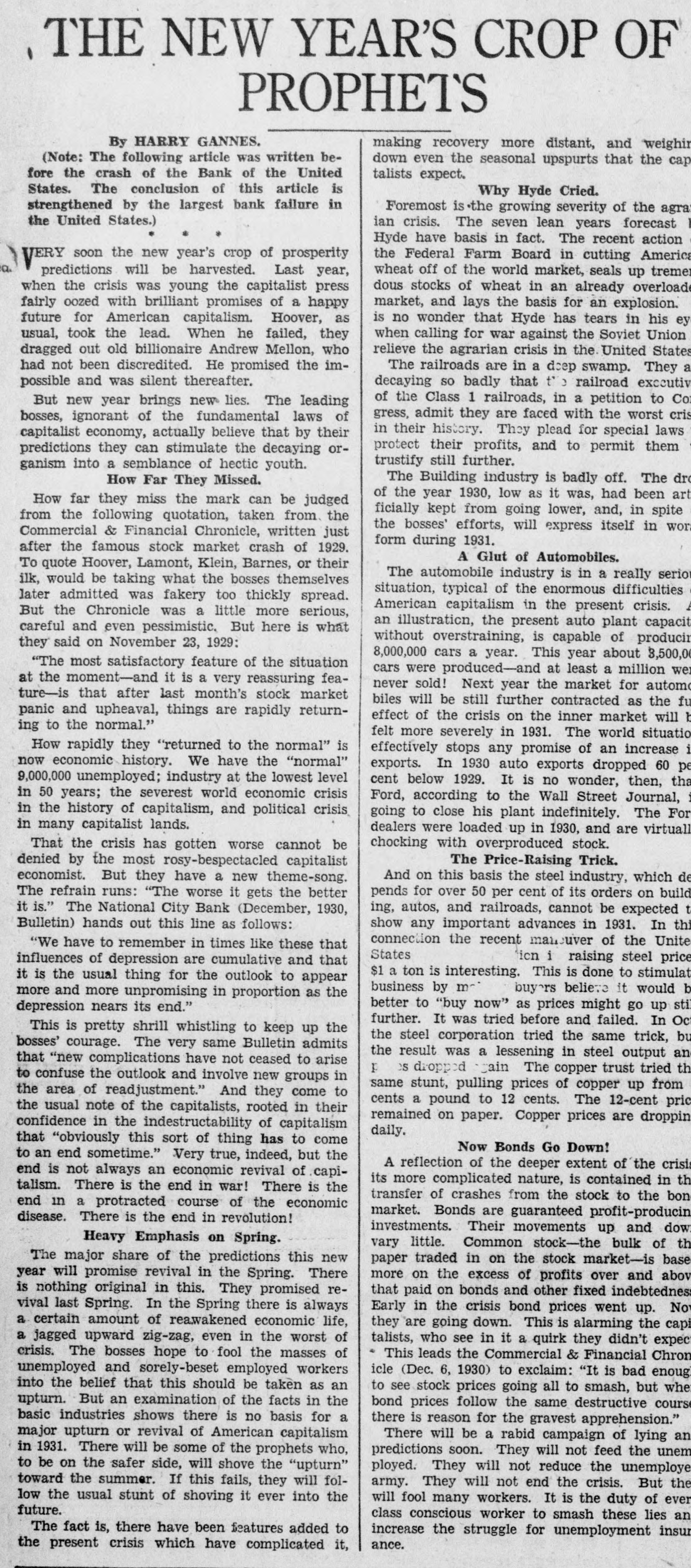 THE NEW YEAR'S CROP OF PROPHETS By HARRY GANNES. making recovery more distant, and weighir (Note: The following article was written bedown even the seasonal upspurts that the cap fore the crash of the Bank of the United talists expect. States. The conclusion of this article is Why Hyde Cried. strengthened by the largest bank failure in Foremost is the growing severity of the agra the United States.) ian crisis. The seven lean years forecast 1 Hyde have basis in fact. The recent action VERY soon the new year's crop of prosperity the Federal Farm Board in cutting America predictions will be harvested. Last year, wheat off of the world market, seals up tremer when the crisis was young the capitalist press dous stocks of wheat in an already overloade fairly oozed with brilliant promises of a happy market, and lays the basis for an explosion. future for American capitalism. Hoover, as is no wonder that Hyde has tears in his ey usual, took the lead. When he failed, they when calling for war against the Soviet Union dragged out old billionaire Andrew Mellon, who relieve the agrarian crisis in the United States had not been discredited. He promised the imThe railroads are in a deep swamp. They a possible and was silent thereafter. decaying SO badly that the railroad exccutiv of the Class 1 railroads, in a petition to Co But new year brings new lies. The leading gress, admit they are faced with the worst cris bosses, ignorant of the fundamental laws of in their history. They plead for special laws capitalist economy, actually believe that by their protect their profits, and to permit them predictions they can stimulate the decaying ortrustify still further. ganism into a semblance of hectic youth. The Building industry is badly off. The dro How Far They Missed. of the year 1930, low as it was, had been art How far they miss the mark can be judged ficially kept from going lower, and, in spite from the following quotation, taken from. the the bosses' efforts, will express itself in word Commercial & Financial Chronicle, written just form during 1931. after the famous stock market crash of 1929. A Glut of Automobiles. To quote Hoover, Lamont, Klein, Barnes, or their The automobile industry is in a really serior ilk, would be taking what the bosses themselves situation, typical of the enormous difficulties later admitted was fakery too thickly spread. American capitalism in the present crisis. b But the Chronicle was a little more serious, an illustration, the present auto plant capacit careful and even pessimistic, But here is what without overstraining, is capable of producir they said on November 23, 1929: 8,000,000 cars a year. This year about 3,500,00 "The most satisfactory feature of the situation cars were produced-and at least a million wer at the moment-and it is a very reassuring feanever sold! Next year the market for automo ture-is that after last month's stock market biles will be still further contracted as the fu panic and upheaval, things are rapidly returneffect of the crisis on the inner market will b ing to the normal." felt more severely in 1931. The world situatio How rapidly they "returned to the normal" is effectively stops any promise of an increase i now economic history. We have the "normal" exports. In 1930 auto exports dropped 60 pe 9,000,000 unemployed; industry at the lowest level cent below 1929. It is no wonder, then, tha in 50 years; the severest world economic crisis Ford, according to the Wall Street Journal, 5 in the history of capitalism, and political crisis going to close his plant indefinitely. The For in many capitalist lands. dealers were loaded up in 1930, and are virtuall chocking with overproduced stock. That the crisis has gotten worse cannot be The Price-Raising Trick. denied by the most rosy-bespectacled capitalist And on this basis the steel industry, which de economist. But they have a new theme-song. pends for over 50 per cent of its orders on build The refrain runs: "The worse it gets the better it is." The National City Bank (December, 1930, ing, autos, and railroads, cannot be expected t Bulletin) hands out this line as follows: show any important advances in 1931. In thi connection the recent maneuver of the Unite "We have to remember in times like these that States icn i raising steel price influences of depression are cumulative and that $1 a ton is interesting. This is done to stimulat it is the usual thing for the outlook to appear business by m~ buyers believe it would b more and more unpromising in proportion as the better to "buy now" as prices might go up stil depression nears its end." further. It was tried before and failed. In Oct This is pretty shrill whistling to keep up the the steel corporation tried the same trick, bu bosses' courage. The very same Bulletin admits the result was a lessening in steel output an that "new complications have not ceased to arise p S dropped tain The copper trust tried th to confuse the outlook and involve new groups in same stunt, pulling prices of copper up from the area of readjustment." And they come to cents a pound to 12 cents. The 12-cent pric the usual note of the capitalists, rooted in their remained on paper. Copper prices are droppin confidence in the indestructability of capitalism daily. that "obviously this sort of thing has to come Now Bonds Go Down! to an end sometime." Very true, indeed, but the A reflection of the deeper extent of the crisis end is not always an economic revival of capiits more complicated nature, is contained in th talism. There is the end in war! There is the transfer of crashes from the stock to the bon end in a protracted course of the economic market. Bonds are guaranteed profit-producin disease. There is the end in revolution! investments. Their movements up and dow Heavy Emphasis on Spring. vary little. Common stock-the bulk of th The major share of the predictions this new paper traded in on the stock market-is base year will promise revival in the Spring. Ther