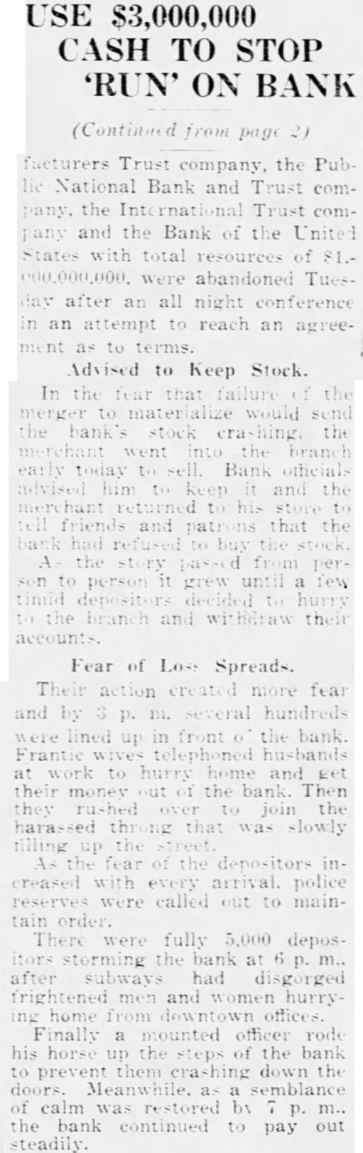 USE $3,000,000 CASH TO STOP 'RUN' ON BANK (Continued from page 21 facturers Trust company, the Public National Bank and Trust company. the International Trust company and the Bank of the United States with total resources of $1,000,000,000, were abandoned Tuesday after an all night conference in an attempt to reach an agreement as to terms. Advised to Keep Stock. In the fear that failure of the merger to materialize would send the bank's stock crashing. the merchant went into the branch early today to sell. Bank officials advised him to keep it and the merchant returned to his store to tell friends and patrons that the bank had refused to buy the stock. As the story passed from person to person it grew until a few timid depositors decided to hurry to the branch and withdraw their accounts. Fear of Los: Spreads. Their action created more fear and by 3 p. m. several hundreds were lined up in front 0 the bank. Frantic wives telephoned husbands at work to hurry home and get their money out of the bank. Then they rushed over to join the harassed throng that was slowly filling up the street. As the fear of the depositors increased with every arrival, police reserves were called out to maintain order. There were fully 5,000 depositors storming the bank at 6 p. m after subways had disgorged frightened men and women hurrying home from downtown offices. Finally a mounted officer rode his horse up the steps of the bank to prevent them crashing down the doors. Meanwhile. as a semblance of calm was restored b. 7 p. m., the bank continued to pay out steadily.