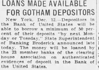 LOANS MADE AVAILABLE FOR GOTHAM DEPOSITORS New York. Dec. Depositors Bank of United States will able to borrow minimum of 50 cent their "by next Mon day Banking Broderick announced late today. money will be loaned by the 23 member banks of the clearing association authenticated deposit in the Bank of the United States.
