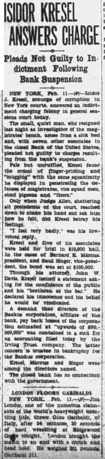 ISIDOR KRESEL ANSWERS CHARGE Pleads Not Guilty to Indictment Following Bank Suspension NEW YORK, Feb. Kresel, scourge of corruption in New York courts. an indictment charging felony in general sescourt today. The small, quiet man. who resigned last night as investigator of the magistrates' bench. arose from sick bed and, with seven other the closed Bank of the United States, pleaded not guilty to charges resulting from the bank's Pale but Kresel faced the ordeal of and "mugging" with the same he displayed in the defenses of magistrates, vice squad men, stool pigeons and "fixers." Only when Judge Allen, shattering all precedents of the court, reached down to his hand ask him how he did Kresel betray his feelings. feel very was his reply. Kresel and five of his associates were held for trial in $10,000 In the cases of Bernard K. president, and Saul Singer, dent, the bond was set at Through his attorney. John Davis, Kresel issued statement askfor the confidence of the public and his "brethren the bar. He declared his and his belief he would be vindicated demand that directors of the Bankus affiliate bank, pay back losses the corpora= tion estimated at "upwards of 000,000" was suit for # accounting filed today by the Irving Trust company The latter trustee in bankruptcy for the Bankus Marcus and Singer were among the directors The closed bank has no connection with the government. LONDOS FLOORS GARIBALDI NEW YORK, Feb. Londos, one of the claimants of the world's wresthing title, threw Gino Garibaldi, of Italy, after 34 minutes, 20 seconds hard wrestling Ridgewood tonight. London brought the to an end with crotch and hold. He weighed 201 Garibaldi