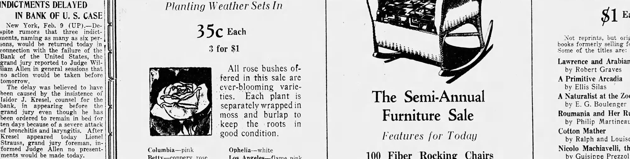 INDICTMENTS DELAYED IN BANK OF U. S. CASE New York, Feb. 9 (UP) spite rumors that three indict- 35c Each ments, naming as many as six persons, would be returned today in 3 for $1 connection with the failure of the Some of the titles are: Bank of the United States, the grand jury reported to Judge William Allen in general sessions that All rose bushes ofby Robert Graves no action would be taken before fered in this sale are A Primitive Arcadia tomorrow. The delay was believed to have ever-blooming varie- by Ellis Silas been caused by the insistence of ties. Each plant is The Semi-Annual A Naturalist at the Zoo Isidor J. Kresel, counsel for the by E. G. Boulenger bank, in appearing before the separately wrapped in grand jury even though he has Roumania and Her Rulers moss and burlap to Furniture Sale been ordered to remain in bed for by Philip Martineau ten days because of severe attack keep the roots in of bronchitis and laryngitis. After Cotton Mather good condition. Kresel appeared today Lionel Features for Today by Ralph and Louise Boas Strauss, grand jury foreman, informed Judge Allen no present- Columbia-pink Ophelia-white ments would be made today. 100 Fiber Rocking Chairs by Guisippe Prezzolini Betty-coppery rose Los Angeles-flame pink