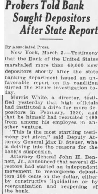 Probers Told Bank Sought Depositors After State Report By Associated Press. New York, March 3.-Testimony that the Bank of the United States marshaled more than 60,000 new depositors shortly after the state banking department issued an unfavorable report on its condition stirred the Steuer investigation to- Morris White. a director, testified yesterday that high officials had instituted drive for more depositors in February, 1930, and that he himself had recruited 1400 from among his employes in another venture. "This is the most startling testimony yet given, said Deputy Attorney General Max D. Steuer, who is into the reasons for the bank's Attorney General John H. Bennett, Jr., announced that several directors had started an independent movement to recompense depositors 100 cents on the dollar, either by constructive liquidation or by eorganization and reopening of the bank.