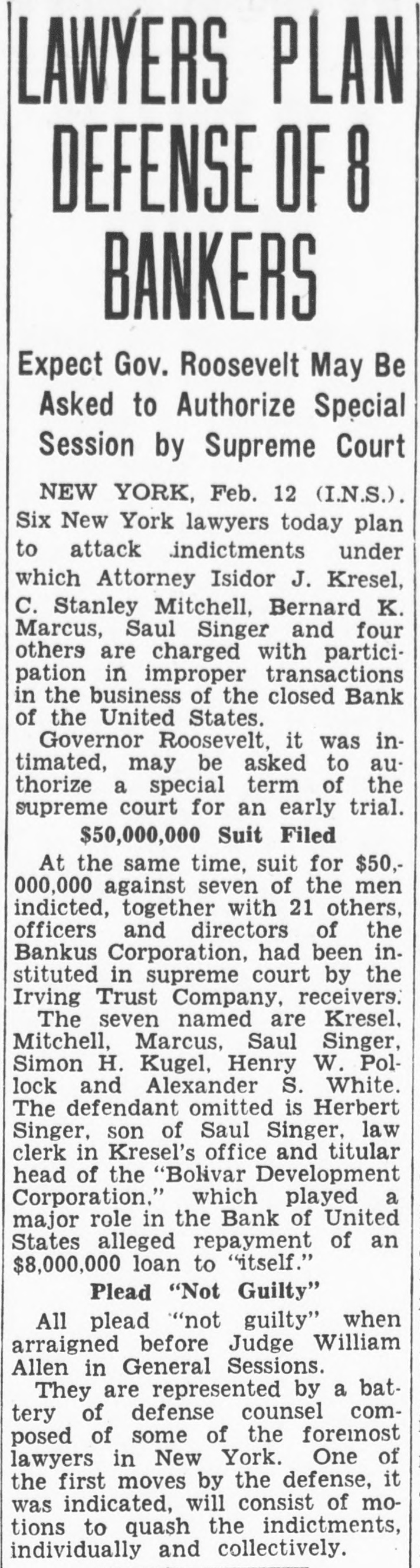 LAWYERS PLAN DEFENSE OF 8 BANKERS Expect Gov. Roosevelt May Be Asked to Authorize Special Session by Supreme Court NEW YORK, Feb. 12 (I.N.S.). Six New York lawyers today plan to attack .indictments under which Attorney Isidor J. Kresel, C. Stanley Mitchell, Bernard K. Marcus, Saul Singer and four others are charged with participation in improper transactions in the business of the closed Bank of the United States. Governor Roosevelt, it was intimated, may be asked to authorize a special term of the supreme court for an early trial. $50,000,000 Suit Filed At the same time, suit for $50,000,000 against seven of the men indicted, together with 21 others, officers and directors of the Bankus Corporation, had been instituted in supreme court by the Irving Trust Company, receivers. The seven named are Kresel, Mitchell, Marcus, Saul Singer, Simon H. Kugel, Henry W. Pollock and Alexander S. White. The defendant omitted is Herbert Singer, son of Saul Singer, law clerk in Kresel's office and titular head of the "Bolivar Development Corporation." which played a major role in the Bank of United States alleged repayment of an $8,000,000 loan to "itself." Plead "Not Guilty" All plead "not guilty" when arraigned before Judge William Allen in General Sessions. They are represented by a battery of defense counsel composed of some of the foremost lawyers in New York. One of the first moves by the defense, it was indicated, will consist of motions to quash the indictments, individually and collectively.