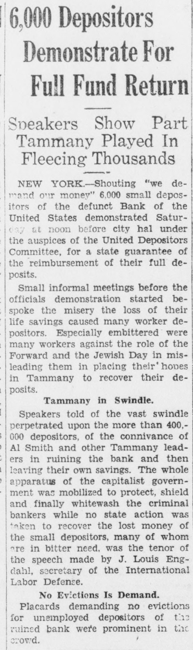 # 6,000 Depositors Demonstrate For Full Fund Return # Speakers Show Part Tammany Played In Fleecing Thousands NEW YORK.--Shouting "we demand our money" 6,000 small depositors of the defunct Bank of the United States demonstrated Saturday at noon before city hal under the auspices of the United Depositors Committee, for a state guarantee of the reimbursement of their full deposits. Small informal meetings before the officials demonstration started be-spoke the misery the loss of their life savings caused many worker depositors. Especially embittered were many workers against the role of the Forward and the Jewish Day in misleading them in placing their hopes in Tammany to recover their deposits. Tammany in Swindle. Speakers told of the vast swindle perpetrated upon the more than 400,000 depositors, of the connivance of Al Smith and other Tammany leaders in ruining the bank and then leaving their own savings. The whole apparatus of the capitalist government was mobilized to protect, shield and finally whitewash the criminal bankers while no state action was taken to recover the lost money of the small depositors, many of whom are in bitter need, was the tenor of the speech made by J. Louis Engdahl, secretary of the International Labor Defense. # No Evictions Is Demand. Placards demanding no evictions for unemployed depositors of the ruined bank were prominent in the crowd.