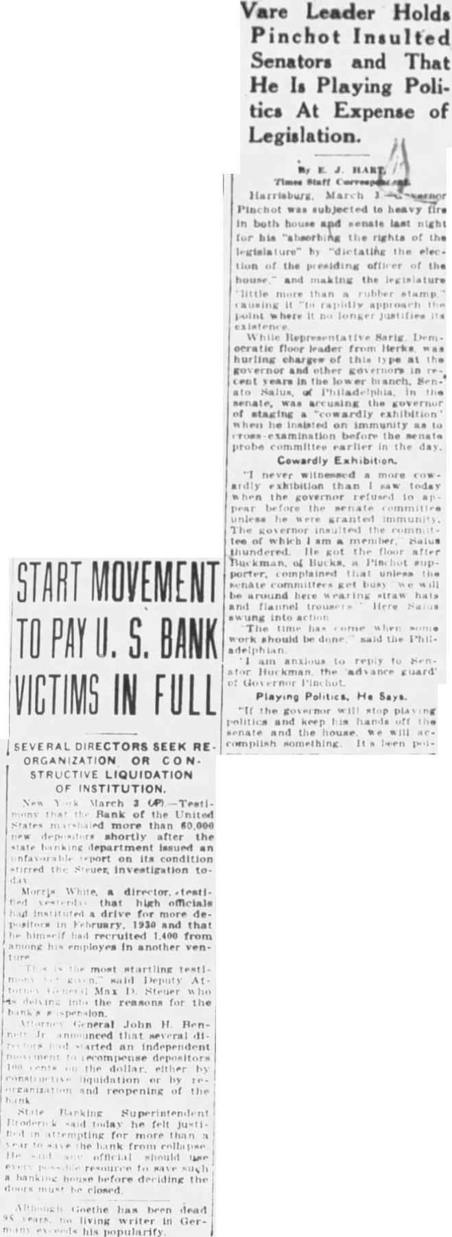 START MOVEMENT PAY U. S. BANK VICTIMS IN FULL SEVERAL DIRECTORS SEEK RE ORGANIZATION OR STRUCTIVE LIQUIDATION OF INSTITUTION. March (AP) Bank of the United more than 000 shortly after the department Issued an on its the to director that high drive for more 1930 and that recruited 400 from Deputy At Max the reasons for the John H. Benan depositors 100 dollar either by by organization and reopening of the Banking he felt for han official should to house before deciding the be closed Goethe has been dead as the living writer in Ger" his popularity Vare Leader Holds Pinchot Insulted Senators and That He Is Playing Politics At Expense of Legislation. to fire in both house and senate for his the of the by the of and the point It floor leader from charges of this and governors years in the senate, was accusing the governor of staging he on as to before probe Cowardly Exhibition. today the governor the tee got complained unless get be around and trousers should be the to reply of "If the politics and keep and the been