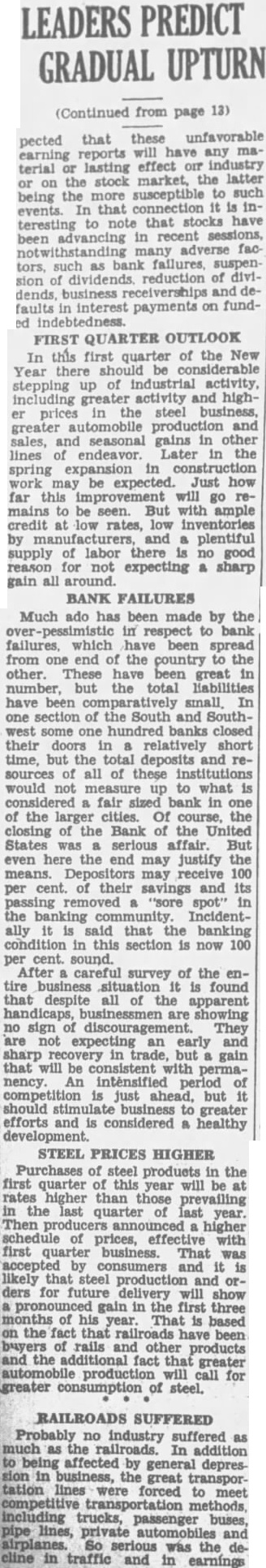 LEADERS PREDICT GRADUAL UPTURN (Continued from page 13) pected that these unfavorable earning reports will have any material or lasting effect or industry or on the stock market, the latter being the more susceptible to such events. In that connection it is interesting to note that stocks have been advancing in recent sessions, notwithstanding many adverse factors, such as bank failures, suspension of dividends. reduction of dividends, business receiverships and defaults in interest payments on funded indebtedness. FIRST QUARTER OUTLOOK In this first quarter of the New Year there should be considerable stepping up of industrial activity, including greater activity and higher prices in the steel business, greater automobile production and sales, and seasonal gains in other lines of endeavor. Later in the spring expansion in construction work may be expected. Just how far this improvement will go remains to be seen. But with ample credit at low rates, low inventories by manufacturers, and a plentiful supply of labor there is no good reason for not expecting a sharp gain all around. BANK FAILURES Much ado has been made by the over-pessimistic in respect to bank failures, which have been spread from one end of the country to the other. These have been great in number, but the total liabilities have been comparatively small, In one section of the South and Southwest some one hundred banks closed their doors in a relatively short time, but the total deposits and resources of all of these institutions would not measure up to what is considered a fair sized bank in one of the larger cities. Of course, the closing of the Bank of the United States was a serious affair. But even here the end may justify the means. Depositors may receive 100 per cent. of their savings and its passing removed a "sore spot" in the banking community. Incidentally it is said that the banking condition in this section is now 100 per cent. sound. After careful survey of the entire business situation it is found that despite all of the apparent handicaps, are showing no sign of discouragemen They are not expecting an early and sharp recovery in trade, but a gain that will be consistent with permanency. An intensified period of competition is just ahead, but it should stimulate business to greater efforts and is considered a healthy development. STEEL PRICES HIGHER Purchases of steel products in the first quarter of this year will be at rates higher than those prevailing in the last quarter of last year Then producers announced higher schedule of prices, effective with first quarter business. That was accepted by consumers and it is likely that steel production and orders for future delivery will show a pronounced gain in the first three months of his year. That is based on the fact that railroads have been buyers of rails and other products and the additional fact that greater automobile production will call for \greater consumption of steel. RAILROADS SUFFERED Probably no industry suffered as much as the railroads. In addition to being affected by general depression in business, the great transportation lines were forced to meet competitive transportation methods, including trucks, passenger buses, pipe lines, private automobiles and airplanes. So serious was the decline in traffic and in earnings