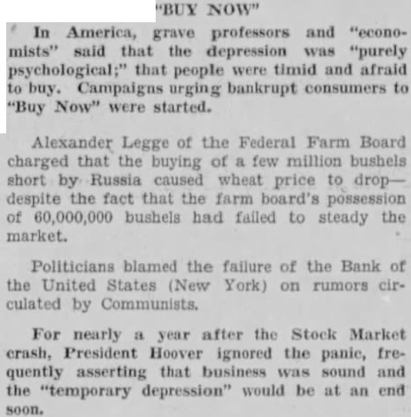 "BUY NOW" In America, grave professors and mists" said that the depression "purely psychological;" that people timid and afraid Campaigns urging bankrupt consumers Now" were started. Alexander Legge of the Federal Farm Board charged that the buying of few million bushels short by Russia caused wheat price despite the fact that the farm possession of 60,000,000 bushels had failed to steady the market. Politicians blamed the failure of the Bank the United States (New York) rumors culated by Communists. For nearly year after the Stock Market crash, President Hoover ignored the panie, frequently asserting that sound and the "temporary depression" would be at end
