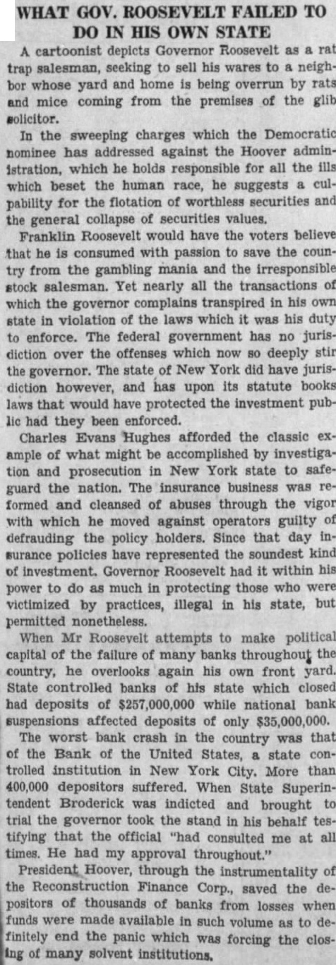 WHAT GOV. ROOSEVELT FAILED TO DO IN HIS OWN STATE cartoonist depicts Governor Roosevelt rat salesman, seeking sell his wares to neightrap bor whose and home is being overrun by rats yard and mice coming from the premises of the glib solicitor. In the sweeping charges which the Democratic nominee has addressed against the Hoover adminwhich he holds for all the ills istration, responsible which beset human race, he suggests the flotation of worthless securities and pability for the general collapse securities values. Franklin Roosevelt would have the voters believe that he is consumed with passion to save the country from the gambling mania and the irresponsible stock salesman. Yet nearly all the transactions which the governor complains transpired in his own state in violation of the laws which was his duty enforce. The federal government has no jurisdiction over the offenses which now SO deeply stir the The state of New York did have jurisgovernor. however, and has its statute books diction upon laws that would have protected the investment pubhad they been enforced. Charles Evans Hughes afforded the classic ample of what might be accomplished by tion and prosecution New York state to safeguard the nation. The insurance business was formed and cleansed of abuses through the vigor with which he moved of against operators guilty defrauding the policy holders. Since that day inhave the soundest kind surance policies represented investment. Governor Roosevelt had within his power to do as much in protecting those who victimized by practices, illegal in his state, but permitted nonetheless. When Mr Roosevelt to make political attempts capital of the failure many banks throughout the country, he overlooks again his own front yard. State controlled banks of his state which closed had deposits of while national bank suspensions affected deposits of only The worst bank crash in the country was that of the Bank of the United States, state trolled institution in New York City. More than depositors suffered. When State Superintendent Broderick was indicted and brought trial the governor took the stand in his behalf testifying that the official "had consulted at all times. He had my approval throughout." Hoover, through the of instrumentality the Finance Corp., saved the positors thousands of banks from losses when funds were made available in such volume as to finitely end the which panic forcing the closmany solvent institutions.