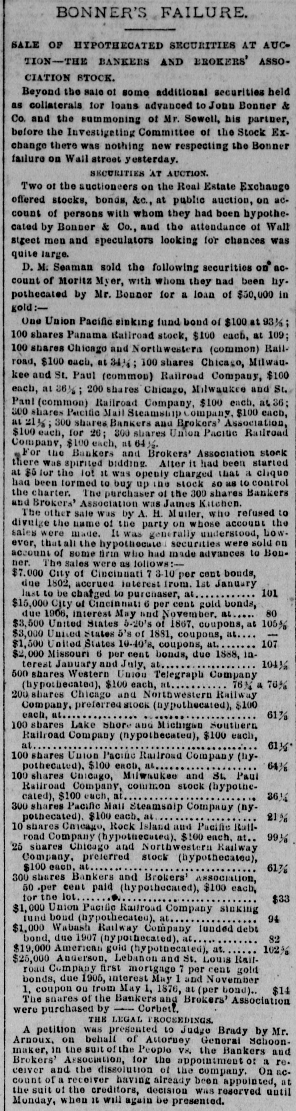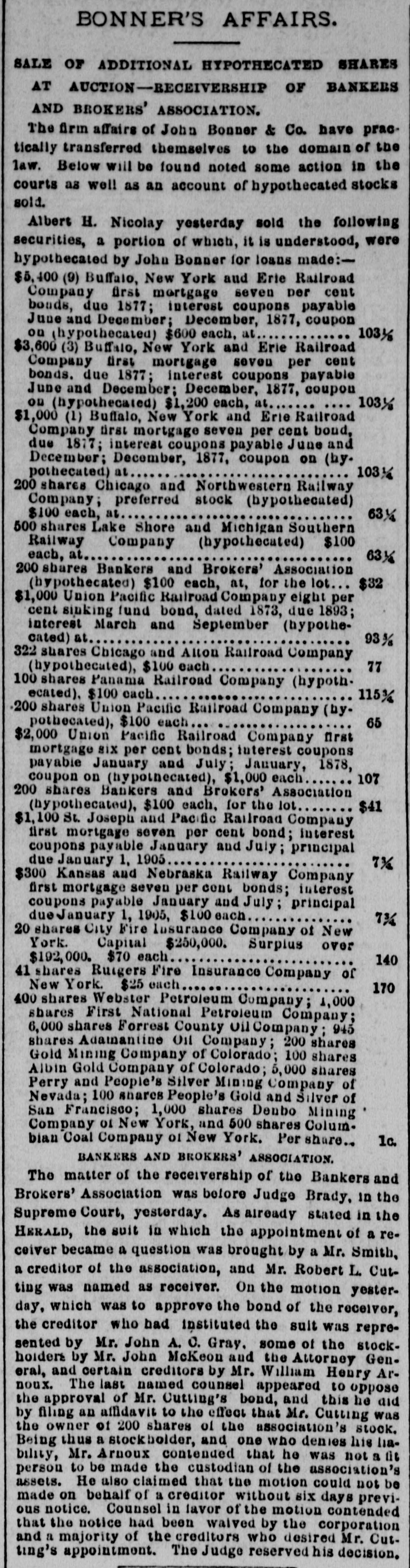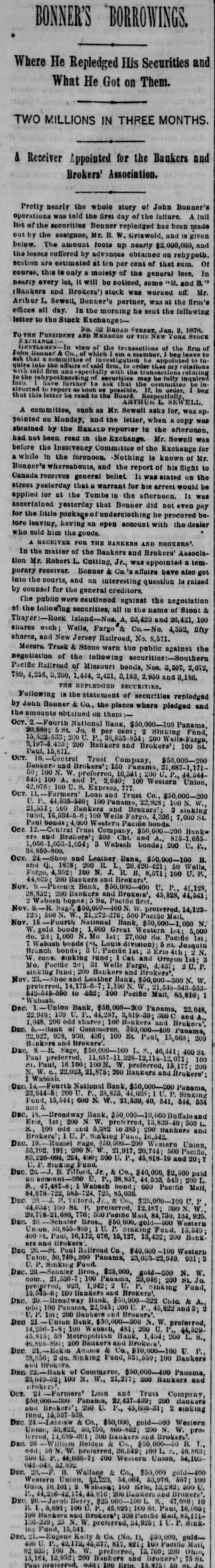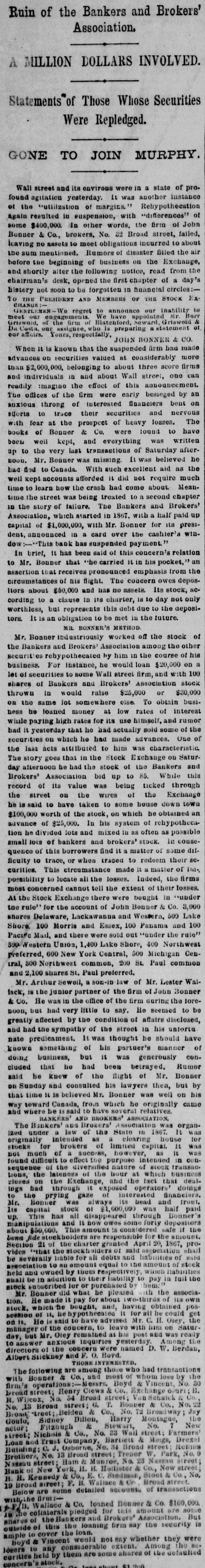 Ruin of the Bankers and Brokers' Association. A MILLION DOLLARS INVOLVED. Statements o Those Whose Securities Were Repledged. GONE TO JOIN MURPHY. Wall street and its environs were in a state of profound agitation yesterday. It was another instance of the "utilization of margins.' Rehypothecation again resulted in suspension, with "differences" of some $400,000. In other words, the firm of John Bonner & Co., brokers, No. 32 Broad street, failed, leaving no assets to meet obligations incurred to about the sum mentioned. Rumors of disaster filled the air before the beginning of business on the Exchange, and shortly alter the following notice, read from the chairman's desk, opened the first chapter of a day's history not soon to be forgotten in huancial circles:To THE PRESIDENT AND MEMBERS OF THE STOCK ExCHANGE GENTLEMEN-We regret to announce our inability to meet our engagements. We have appointed Mr. Burr Griswold, of the firm of Blatenford, Seward Griswold & Da Costa. our assignee, who is preparing " statement of our affairs. Yours,respectfally, JOHN BONNER & CO. When It is known that the suspended arm had made advances on securities valued at considerably more than $2,000,000, belonging to about three score firms and individuals in and about Wall street, one can readily imagine the effect of this announcement. The offices of the firm were early besieged by an anxious throng of interested fluanciers bent on Biforts to trace their securities and nervous with fear at the prospect of heavy losses. The books of Bonner & Co. were found to have been well kept, and everything was written up to the very last transactions of Saturday afternoon. Mr. Bonner was missing. It was believed he had fled to Canada. With such excellent aid as the well kept accounts afforded it did not require much time to learn how the crash had come about Meantime the street was being treated to a second chapter in the story of failure. The Bankers and Brokers' Association, which started in 1867. with a half paid up capital of $1,000,000, with Mr. Bonner for its president, announced in a card over the cashier's winbank has suspended payment. In brief, It has been said of this concern's relation to Mr. Bonner that "he carried It in his pocket," an assertion that receives pronounced emphasis from the circumstances of his flight. The concern owes deposltors about $50,000 and has no assets. Its stock, NCcording to a clause in its charter, is to day not only worthless, but represents this debt due to the depositors. It is an obligation to be met in the future. MR. BONNER'S METHOD. Mr. Bonner industriously worked off the stock of the Bankers and Brokers' Association among the other securit es rehypothecated by him in the course of his business. For instance, he would loan $20,000 on a let of securities to some Wall street firm, and with 100 shares of Bankers and Brokers' Association stock thrown in would raise $25,000 or $30,000 on the same lot somewhere else. To obtain busi. ness he loaned money at low rates of interest while paying high rates for its use himself, and rumor had it yesterday that he had actually sold some of the securities on which he had made advances. One of the last acts attilbuted to him was characteristic The story goes that in the Steck Exchange on Saturday afternoon he had the stock of the Bankers and Brokers' Association bid up to 85. While this record of its value was being ticked through the street on the wires of the Exchange he is said to have taken to some house down town $100,000 worth of the stock, on which he obtained an advance of $25,000. In his system of rehypothecation he divided lots and mixed in as often as possible small lots of bankers and brokers' stock. In consequence of this borrowers find it matter of some difficulty to trace, or when traced to redeem their se. curities. This circumstance made it matter of Da. possibility to locate all the losses. Indeed, the firms most concerned cannot tell the extent of their losses. At the Stock Exchange there were bought in "under the rule" for the account of John Bonner & Co. 3,000 shares Delaware, Lackawanna and Western. 500 Lake Shore, 100 Morris and Essex, 100 Panama and 100 Pacife Mail, and there were sold out "under the rule" 500-Western Union, 1,400 Lake Shore, 400 Northwest preferred, 600 New York Central, 500 Michigan Central, 300 Northwest common, 200 St. Paul common and 2,100 shares St. Paul preferred. Mr. Arthur Sewell, a son-in law of Mr. Lester Wallack, 18 the junior partner of the firm of John Bonner & Co. He was in the office of the firm during the forenoon, but had very little to say. He seemed to be greatly affected by the condition of affairs disclosed, and had the sympathy of the street in his unfortu nate predicament. It was thought be should have known something of his partner's manner of doing business, but it was generously concluded that he had been betrayed. Rumor said he knew of the flight of Mr. Bonner on Sunday and consulted his lawyers then, but by that time It is believed Mr. Bonner was well on his Way toward Canada, from which he originally came and where be said to have several relatives. BANKERS' AND BROKERS' ASSOCIATION. The Bankers' and Brokers' Association was organIzed under a law of the State in 1867. It was originally intended as a clearing house for stocks for brokers of limited capital. It was not much of a success, however, as it was found difficult to effect the purpose intended in consequence of the diversified nature of stock transactions, the lateness of the hour at which business ploses on the Exchange, and the fact that deallogs had through it exposed operators doings to the prying gaze of interested dinanciers. Mr. Bonuer was always its head and front. Its capital stock of $1,000,000 WILS half paid up. This has all disappeared through Bonner 8 manipulations and it now owes some forty depositors about $50,000. This amount is considered safe if the bona fide stockbolders are responsible for the amou