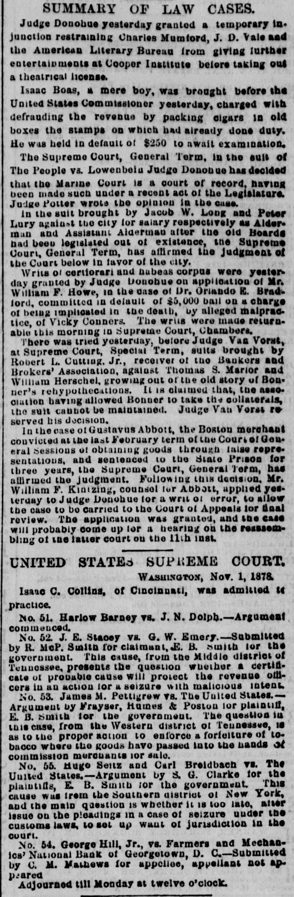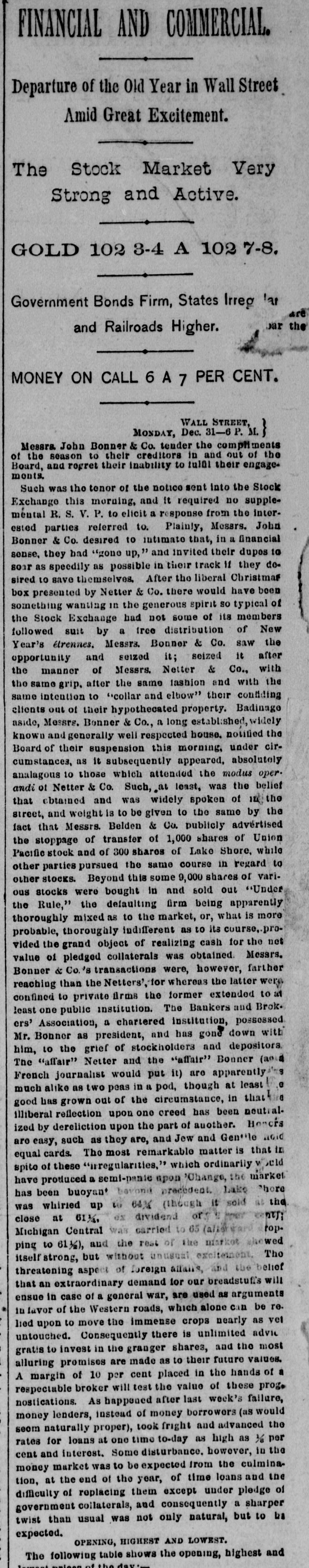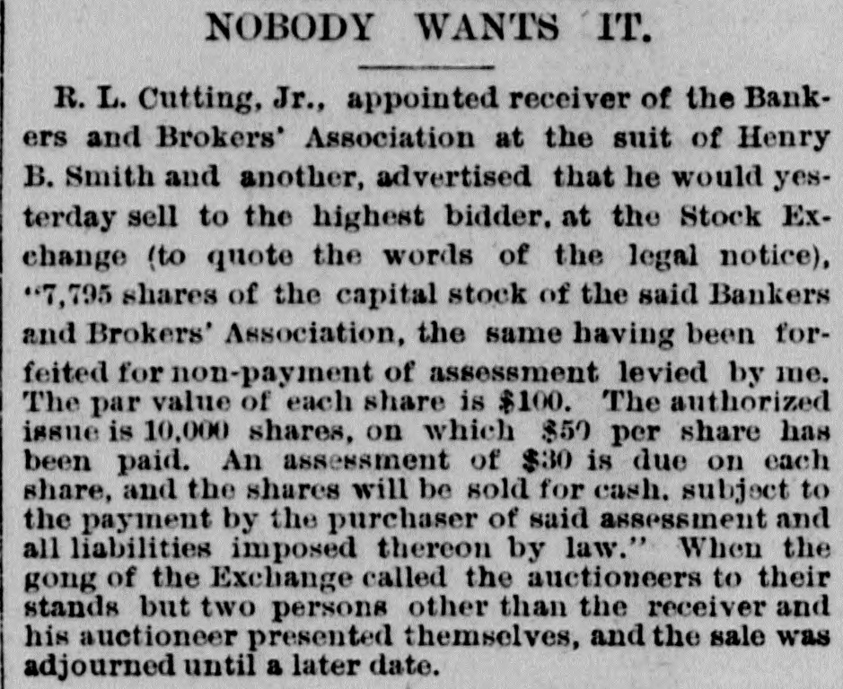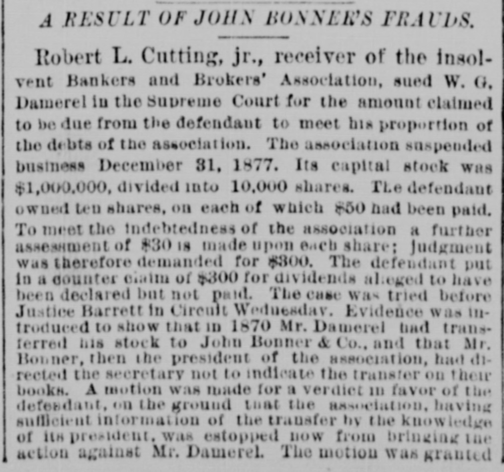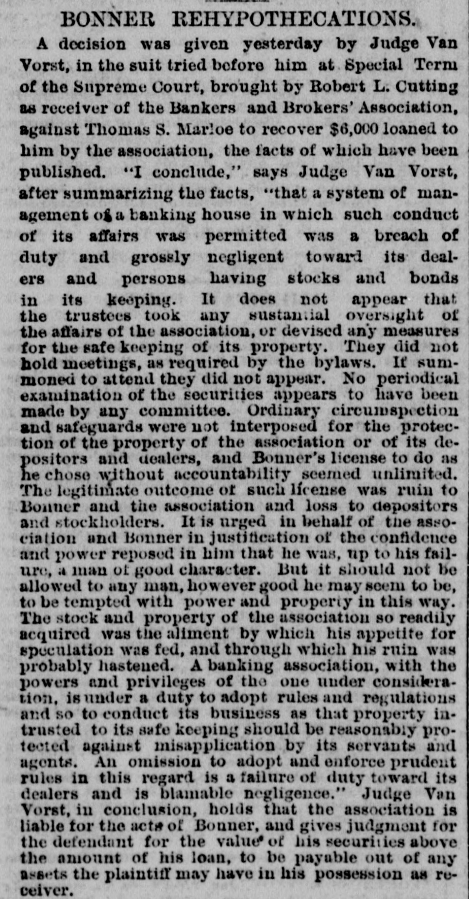 Ruin of the Bankers and Brokers' Association. A MILLION DOLLARS INVOLVED. Statements o Those Whose Securities Were Repledged. GONE TO JOIN MURPHY. Wall street and its environs were in a state of profound agitation yesterday. It was another instance of the "utilization of margins.' Rehypothecation again resulted in suspension, with "differences" of some $400,000. In other words, the firm of John Bonner & Co., brokers, No. 32 Broad street, failed, leaving no assets to meet obligations incurred to about the sum mentioned. Rumors of disaster filled the air before the beginning of business on the Exchange, and shortly alter the following notice, read from the chairman's desk, opened the first chapter of a day's history not soon to be forgotten in huancial circles:To THE PRESIDENT AND MEMBERS OF THE STOCK ExCHANGE GENTLEMEN-We regret to announce our inability to meet our engagements. We have appointed Mr. Burr Griswold, of the firm of Blatenford, Seward Griswold & Da Costa. our assignee, who is preparing " statement of our affairs. Yours,respectfally, JOHN BONNER & CO. When It is known that the suspended arm had made advances on securities valued at considerably more than $2,000,000, belonging to about three score firms and individuals in and about Wall street, one can readily imagine the effect of this announcement. The offices of the firm were early besieged by an anxious throng of interested fluanciers bent on Biforts to trace their securities and nervous with fear at the prospect of heavy losses. The books of Bonner & Co. were found to have been well kept, and everything was written up to the very last transactions of Saturday afternoon. Mr. Bonner was missing. It was believed he had fled to Canada. With such excellent aid as the well kept accounts afforded it did not require much time to learn how the crash had come about Meantime the street was being treated to a second chapter in the story of failure. The Bankers and Brokers' Association, which started in 1867. with a half paid up capital of $1,000,000, with Mr. Bonner for its president, announced in a card over the cashier's winbank has suspended payment. In brief, It has been said of this concern's relation to Mr. Bonner that "he carried It in his pocket," an assertion that receives pronounced emphasis from the circumstances of his flight. The concern owes deposltors about $50,000 and has no assets. Its stock, NCcording to a clause in its charter, is to day not only worthless, but represents this debt due to the depositors. It is an obligation to be met in the future. MR. BONNER'S METHOD. Mr. Bonner industriously worked off the stock of the Bankers and Brokers' Association among the other securit es rehypothecated by him in the course of his business. For instance, he would loan $20,000 on a let of securities to some Wall street firm, and with 100 shares of Bankers and Brokers' Association stock thrown in would raise $25,000 or $30,000 on the same lot somewhere else. To obtain busi. ness he loaned money at low rates of interest while paying high rates for its use himself, and rumor had it yesterday that he had actually sold some of the securities on which he had made advances. One of the last acts attilbuted to him was characteristic The story goes that in the Steck Exchange on Saturday afternoon he had the stock of the Bankers and Brokers' Association bid up to 85. While this record of its value was being ticked through the street on the wires of the Exchange he is said to have taken to some house down town $100,000 worth of the stock, on which he obtained an advance of $25,000. In his system of rehypothecation he divided lots and mixed in as often as possible small lots of bankers and brokers' stock. In consequence of this borrowers find it matter of some difficulty to trace, or when traced to redeem their se. curities. This circumstance made it matter of Da. possibility to locate all the losses. Indeed, the firms most concerned cannot tell the extent of their losses. At the Stock Exchange there were bought in "under the rule" for the account of John Bonner & Co. 3,000 shares Delaware, Lackawanna and Western. 500 Lake Shore, 100 Morris and Essex, 100 Panama and 100 Pacife Mail, and there were sold out "under the rule" 500-Western Union, 1,400 Lake Shore, 400 Northwest preferred, 600 New York Central, 500 Michigan Central, 300 Northwest common, 200 St. Paul common and 2,100 shares St. Paul preferred. Mr. Arthur Sewell, a son-in law of Mr. Lester Wallack, 18 the junior partner of the firm of John Bonner & Co. He was in the office of the firm during the forenoon, but had very little to say. He seemed to be greatly affected by the condition of affairs disclosed, and had the sympathy of the street in his unfortu nate predicament. It was thought be should have known something of his partner's manner of doing business, but it was generously concluded that he had been betrayed. Rumor said he knew of the flight of Mr. Bonner on Sunday and consulted his lawyers then, but by that time It is believed Mr. Bonner was well on his Way toward Canada, from which he originally came and where be said to have several relatives. BANKERS' AND BROKERS' ASSOCIATION. The Bankers' and Brokers' Association was organIzed under a law of the State in 1867. It was originally intended as a clearing house for stocks for brokers of limited capital. It was not much of a success, however, as it was found difficult to effect the purpose intended in consequence of the diversified nature of stock transactions, the lateness of the hour at which business ploses on the Exchange, and the fact that deallogs had through it exposed operators doings to the prying gaze of interested dinanciers. Mr. Bonuer was always its head and front. Its capital stock of $1,000,000 WILS half paid up. This has all disappeared through Bonner 8 manipulations and it now owes some forty depositors about $50,000. This amount is considered safe if the bona fide stockbolders are responsible for the amou