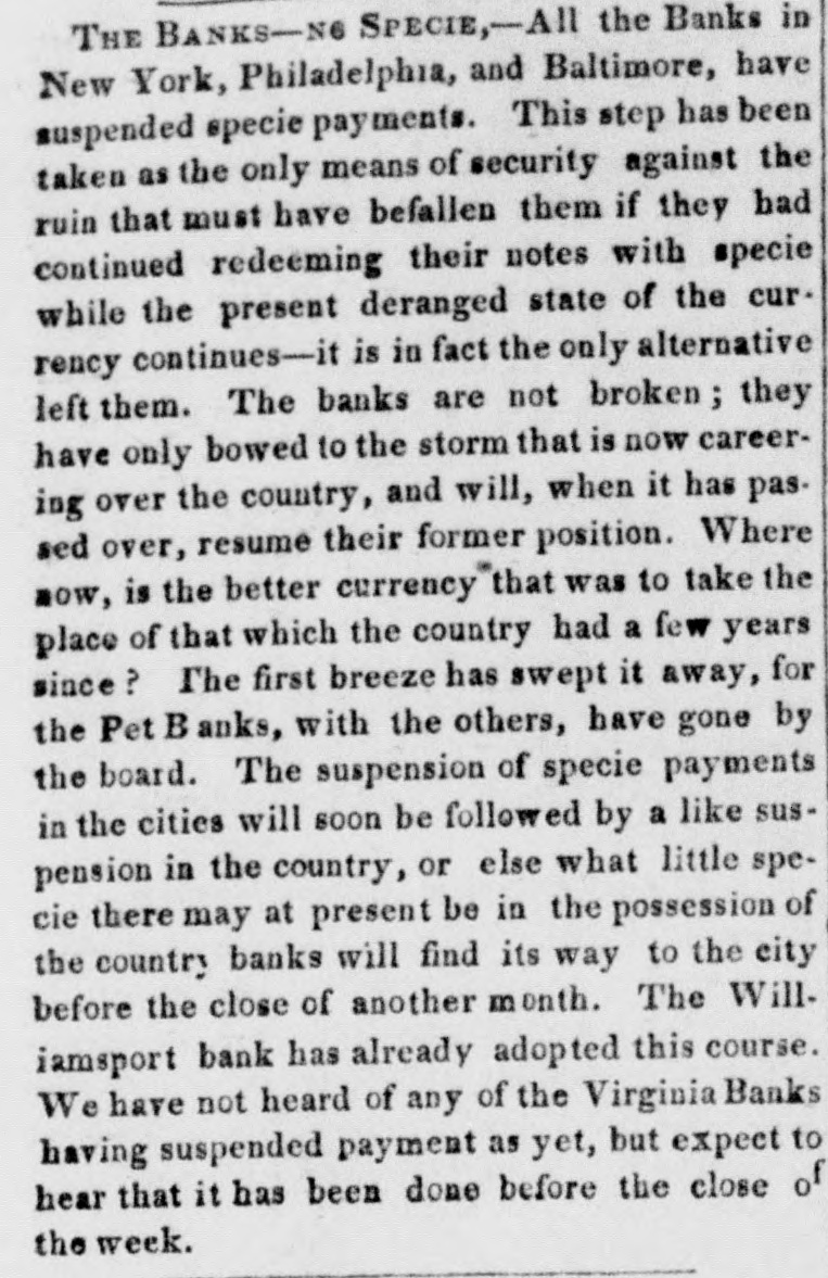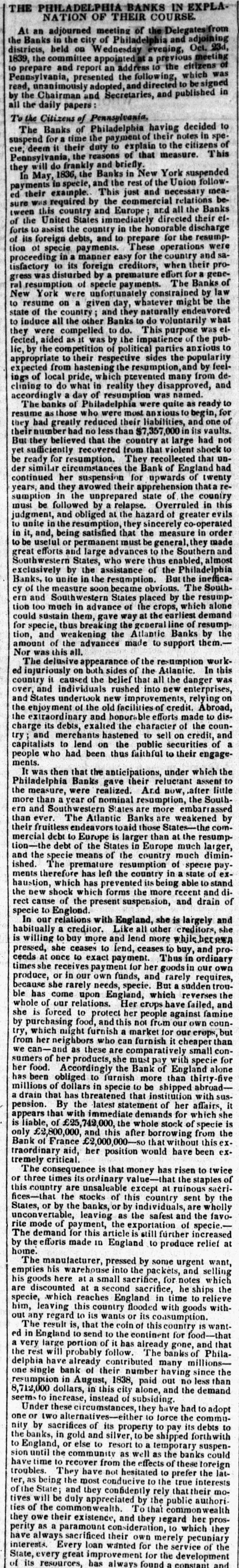 The Banks of Philadelphia having decided to suspend for a time the payment of their notes in specie, deem it their duty to explain to the citizens of Pennsylvania, the reasons of that measure. This they will do frankly and briefly.