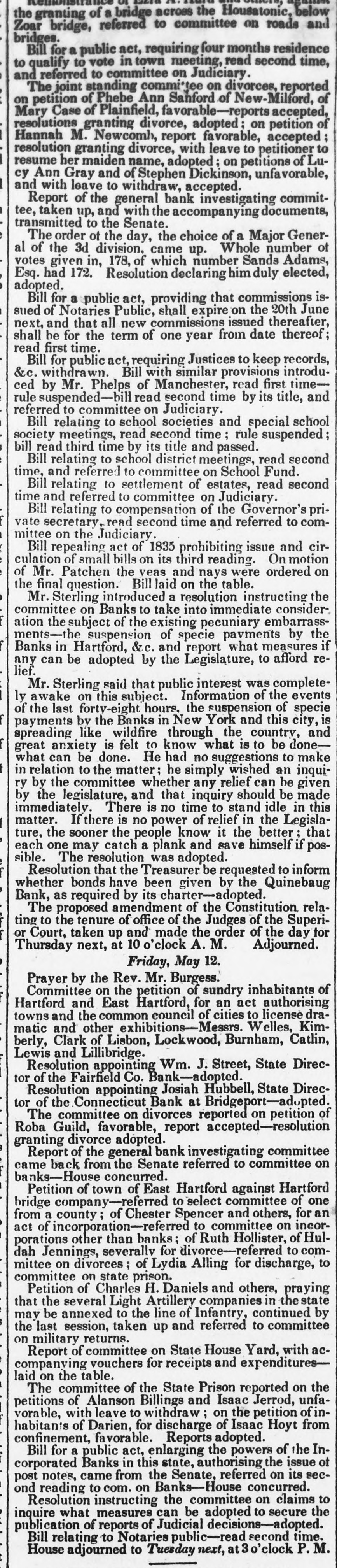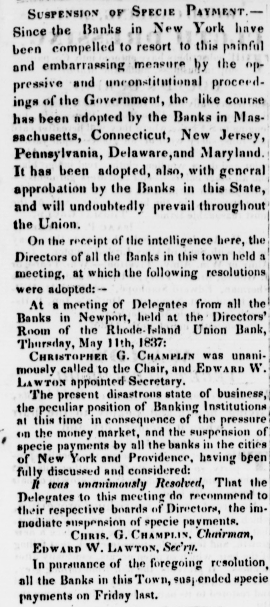 In May, 1836, the Banks in New York suspended payments in specie, and the rest of the Union followed their example. This just and necessary measure was required by the commercial relations between this country and Europe; and all the Banks of the United States immediately directed their efforts to assist the country in the honorable discharge of its foreign debts, and to prepare for the resumption of specie payments. These operations were proceeding in a manner easy for the country and satisfactory to its foreign creditors, when their progress was disturbed by a premature effort for a general resumption of specie payments. The Banks of New York were unfortunately constrained by law to resume on a given day, whatever might be the state of the country; and they naturally endeavored to induce all the other Banks to do voluntarily what they were compelled to do. This purpose was effected, aided as it was by the impatience of the public, by the competition of political parties anxious to appropriate to their respective sides the popularity expected from hastening the resumption, and by feelings of local pride, which prevented many from declining to do what in reality they disapproved, and accordingly a day of resumption was named.
