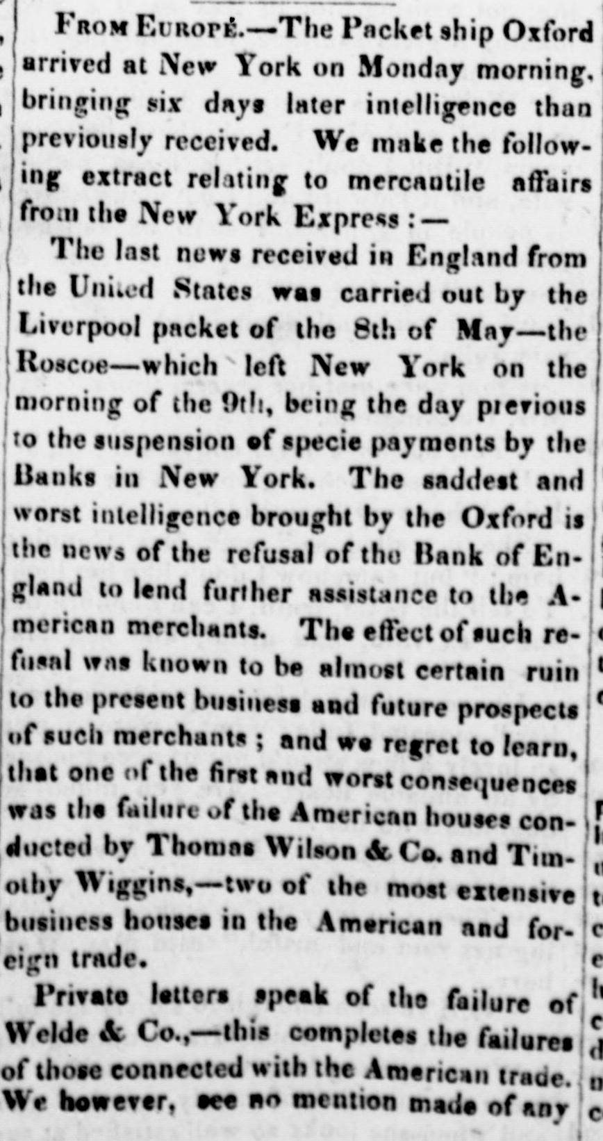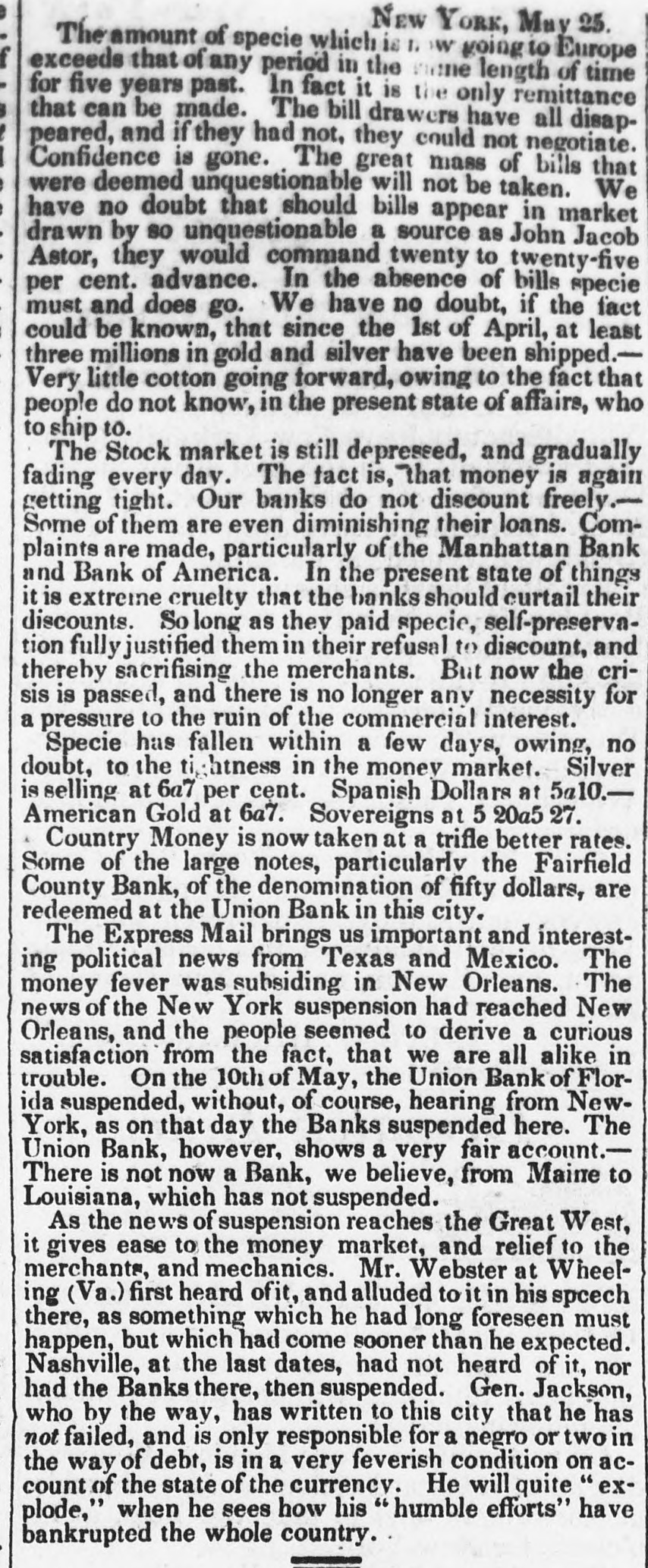 The consequence is that money has risen to twice or three times its ordinary value-that the staples of this country are unsaleable except at ruinous sacrifices that the stocks of this country sent by the States, or by the banks, or by individuals, are wholly unconvertable, leaving as the safest and the favorite mode of payment, the exportation of specie. The demand for this article is still further increased by the efforts made in England to produce relief at home.