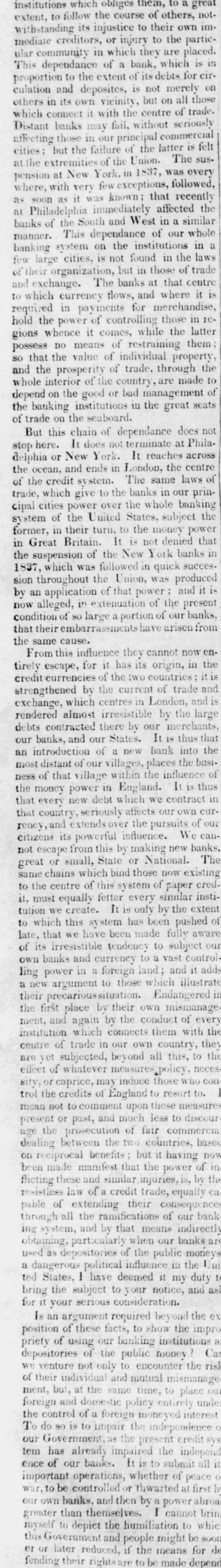 Under these circumstances, they have had to adopt one or two alternatives-either to force the community by sacrifices of its property to pay its debts to the banks, in gold and silver, to be shipped forthwith to England, or else to resort to a temporary suspension until the community as well as the banks could have time to recover from the effects of these foreign troubles. They have not hesitated to prefer the latter, as being the most conducive to the true interests of the State; and they confidently rely that their motives will be duly appreciated by the public authorities of the commonwealth. To that commonwealth they owe their existence, and they regard her prosperity as a paramount consideration, to which they have always sacrificed their own merely pecuniary interests. Every loan wanted for the service of the State, every great improvement for the development of its resources, has always found a constant and