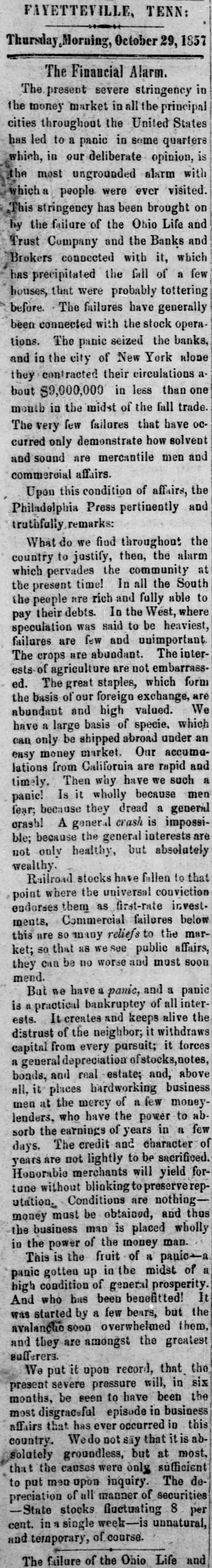 It may be asked, did not the Bank of Tennessee contribute, by its management, to the suspension which now exists? To this, it is replied, that there is nothing to be found in the conduct of the bank to sustain in the slightest degree such a charge. It is evident from the past history of the bank for the four years under which it has been under the direction of its present vigilant directory, and its present condition, that there has been a consistent effort to avoid such an increase of its circulation and such injudicious loans, not based on the produce of the country, as would lead to imprudent and heedless speculation and indebtedness. It is well known to the author of this communication, as well as to many other persons, that the sagacious President of this bank has been predicting the present state of things, and that he has held the bank in a condition to meet the crisis which has come, as well as it could readily be done consistently with the duty imposed on it of supplying the community with circulation and answering in other respects the purposes of its creation. The amount of its circulation for the last four years, since Colonel Johnson has been at its head, is as follows: