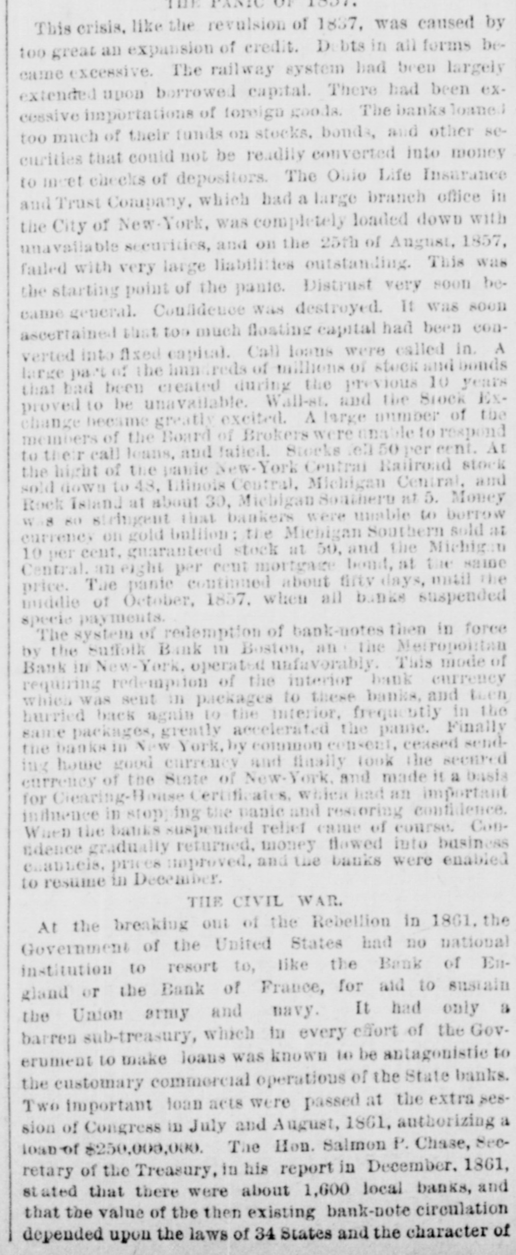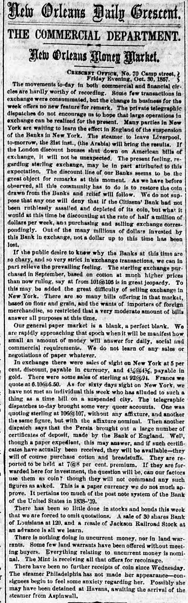 The suspension of specie payments by that bank has been condemned by some. To this it may be replied, that most of the best managed and soundest banks int he United States have suspended-banks over which men of the highest grade of mercantile integrity, honor, and punctuality, preside; men whose whole lives, public and private, like that of the head of the State Bank, are examples of justice and good faith to all men. Every well-informed man in the community knows that the suspension of cash payments by the State Bank was a matter of indispensable necessity, resulting from surrounding circumstances, and not a matter of choice, with a view to make a profit thereby to the State, by the injury to the holders of its million and a half of notes. A suspension by the State Bank, singly and alone, would, in most conceivable cases, have brought disgrace on its managers; but the State Bank is only one of 400 in the United States, the largest portion of which, and all at the great commercial centres, New York, Philadelphia, New Orleans, &c., have suspended.