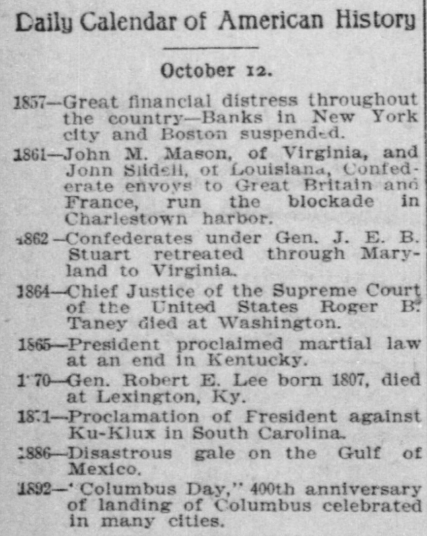 Daily Calendar of American History October 12. 1857-Great financial distress throughout the country-Banks in New York city and Boston suspended. 1861-John M. Mason, of Virginia, and Jonn Slidell, of Louisiana, Confederate envoys to Great Britain and France, run the blockade in Charlestown harbor. 862-Confederates under Gen. J. E. B. Stuart retreated through Maryland to Virginia. 1864-Chief Justice of the Supreme Court of the United States Roger B. Taney died at Washington. 1865-President proclaimed martial law at an end in Kentucky. 1'70-Gen. Robert E. Lee born 1807, died at Lexington, Ky. 18.1-Proclamation of Fresident against Ku-Klux in South Carolina. 1886-Disastrous gale on the Gulf of Mexico. 1892-' Columbus Day," 400th anniversary of landing of Columbus celebrated in many cities.