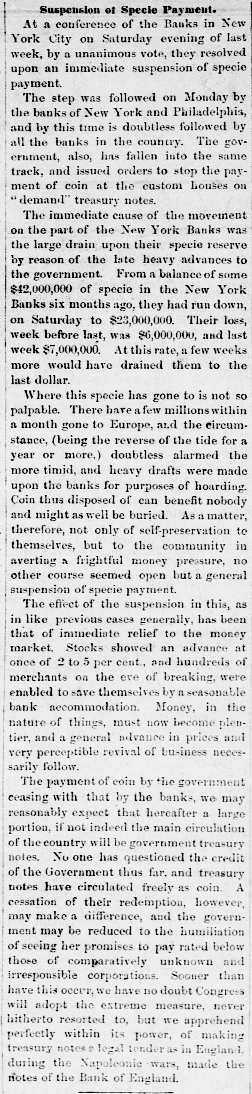 Suspension of Specie Payment. At a conference of the Banks in New York City on Saturday evening of last week, by a unanimous vote, they resolved upon an immediate suspension of specie payment. The step was followed on Monday by the banks of New York and Philadelphis, and by this time is doubtless followed by all the banks in the country. The government, also, has fallen into the same track, and issued orders to stop the payment of coin at the custom houses on "demand" treasury notes. The immediate cause of the movement on the part of the New York Banks was the large drain upon their specie reserve by reason of the late heavy advances to the government. From a balance of some $42,000,000 of specie in the New York Banks six months ago, they had run down, on Saturday to $23,000,000. Their loss, week before last, was $6,000,000, and last week $7,000,000. At this rate, a few weeks more would have drained them to the last dollar. Where this specie has gone to is not so palpable. There have a few millions within a month gone to Europe, and the circumstance, (being the reverse of the tide for a year or more,) doubtless alarmed the more timid, and heavy drafts were made upon the banks for purposes of hoarding. Coin thus disposed of can benefit nobody and might as well be buried. As a matter, therefore, not only of self-preservation to themselves, but to the community in averting a frightful money pressure, no other course seemed open but a general suspension of specie payment. The effect of the suspension in this, as in like previous cases generally, has been that of immediate relief to the money market. Stocks showed an advance at once of 2 to 5 per cent., and hundreds of merchants on the eve of breaking, were enabled to save themselves by a seasonable bank accommodation. Money, in the nature of things, must now become plentier, and a general advance in prices and very perceptible revival of business necessarily follow. The payment of coin by the government ceasing with that by the banks, we may reasonably expect that hereafter a large portion, if not indeed the main circulation of the country will be government treasury notes. No one has questioned the credit of the Government thus far. and treasury notes have circulated freely as coin. A cessation of their redemption, however, may make a difference, and the government may be reduced to the humiliation of seeing her promises to pay rated below those of comparatively unknown and irresponsible corporations. Sooner than have this occur, we have no doubt Congress will adopt the extreme measure, never hitherto resorted to, but we apprehend perfectly within its power, of making treasury notes : legal tender as in England. during the Napoleonic wars, made the notes of the Bank of England.