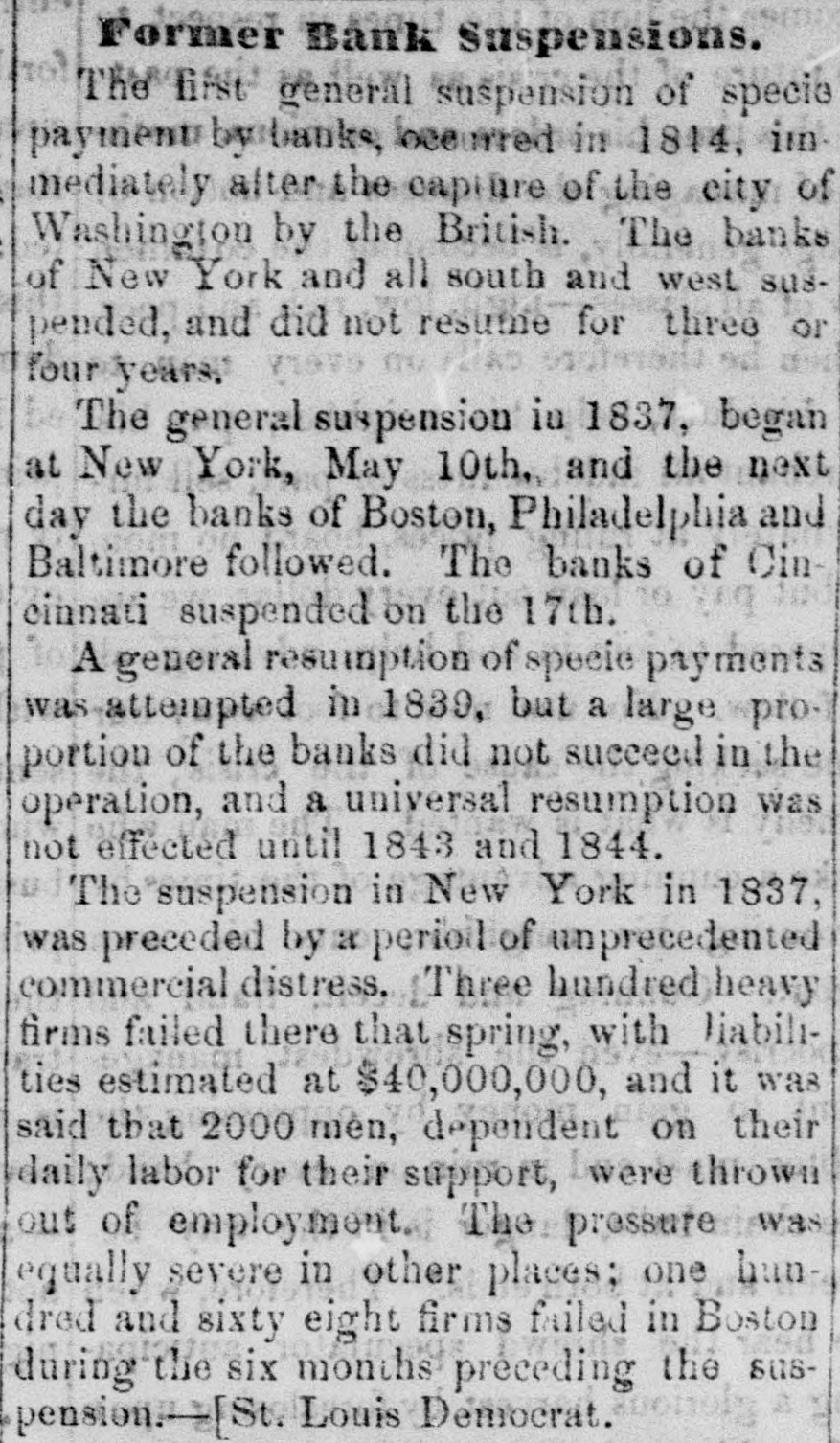 # Former Bank Suspensions. The first general suspension of specie payment by banks, occurred in 1814, immediately after the capture of the city of Washington by the British. The banks of New York and all south and west suspended, and did not resume for three or four years. The general suspension in 1837, began at New York, May 10th, and the next day the banks of Boston, Philadelphia and Baltimore followed. The banks of Cincinnati suspended on the 17th. A general resumption of specie payments was attempted in 1839, but a large proportion of the banks did not succeed in the operation, and a universal resumption was not effected until 1843 and 1844. The suspension in New York in 1837, was preceded by a period of unprecedented commercial distress. Three hundred heavy firms failed there that spring, with liabilities estimated at $40,000,000, and it was said that 2000 men, dependent on their daily labor for their support, were thrown out of employment. The pressure was equally severe in other places; one hundred and sixty eight firms failed in Boston during the six months preceding the suspension. [St. Louis Democrat.