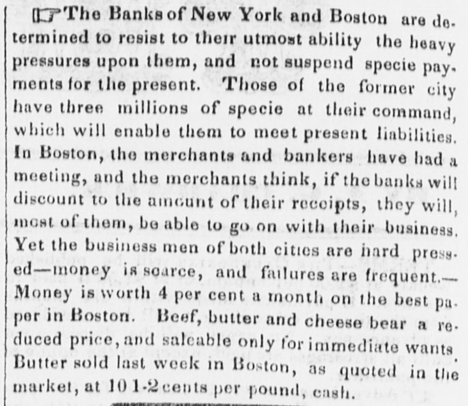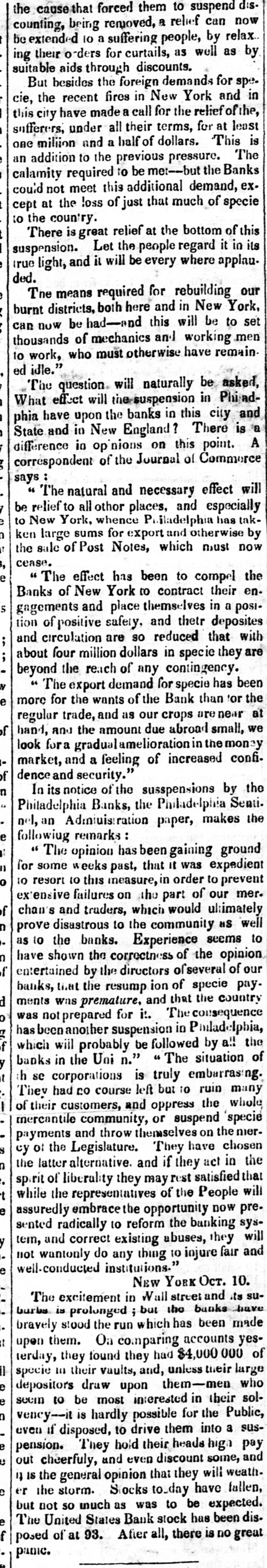 the cause that forced them to suspend dis counting, being removed, a relief can now be extended 10 a suffering people, by relax ing their o ders for curtails, as well as by suitable aids through discounts. But besides the foreign demands for spe. cie, the recent fires in New York and in this have made a relief of the, all their terms, sufferers, city under call for the for at least one miliion and a half of dollars. This is an addition to the previous pressure. The calamity required to be met--but the Banks could not meet this additional demand, except at the loss of just that much of specie to the country. There is great relief at the bottom of this suspension. Let the people regard it in its true light, and it will be every where applauded. The means required for rebuilding our burnt districts, both here and in New York, can now be had-and this will be to set thousands of mechanics and working men to work, who must otherwise have remain ed idle." The question will naturally be asked, What effect will the suspension in Phinaphia have upon the banks in this city and and in New England? There is a in pinions on difference State this point. A correspondent of the Journal of Commerce says : " The natural and necessary effect will be relief to all other places, and especially to New York, whence Philadelphia has takken large sums for export and otherwise by the sale of Post Notes, which must now cease. 3, e The effect has been to compel the Banks of New York to contract their enS gagements and place themselves in a position of positive safety, and thetr deposites and circulation are so reduced that with ; about four million dollars in specie they are ; beyond the reach of any contingency. N The export demand for specie has been e more for the wants of the Bank than for the regular trade, and as our crops are near at of hand, and the amount due abroad small, we look fora gradual amelioration in the money market, and a feeling of increased confiof dence and security." n In its notice of the susspensions by the Philadelphia Banks, the Philadelphia Senti. nel, an Administration paper, makes the e following remarks: " : The opinion has been gaining ground in for some weeks past, that it was expedient o 10 resort to this measure, in order to prevent extensive failures on the part of our mer. f chan's and truders, which would ultimately n prove disastrous to the community as well as to the banks. Experience seems to n have shown the correctness of the opinion f entertained by the directors of several of our banks, that the resump ion of specie pay. d ments was not prepared was premature, for it. and The that consequence the country has been another suspension in Philadelphia, f which will probably be followed by a!! the banks in the Uni n." " The situation of y t h se corporations is truly embarrasing. had DO course 10 many of and They their customers, left oppress but ruin the whole mercantile community, or suspend specie payments and throw themselves on the miercy of the Legislature. They have chosen the latter alternative. and if they act in the sp.rit of liberality they may rest satisfied while the representatives of the People will assuredly embrace the opportunity now presented radically to reform the banking system, and correct existing abuses, they will y not wantonly do any thing to injure fair and well-conducted institutions. e NEW YORK OCT. 10. The excitement in Wall street and its suburbs is prolonged but the banks have bravely stood the run which has been made it upon them. Oa comparing accounts yesterday, they found they had $4,000 000 of il specie 10 their vaults, and, unless their large e depositors draw upon them-men who e seem to be most interested in their soln vency-it is hardly possible for the Public, even if disposed, to drive them into a suspension. They hold their heads higa pay out cheerfuly, and even discount some, and 11 IS the general opinion that they will weath. er the storm. Stocks to day have fallen, but not so much as was to be expected. e The United States Bank stock has been disf posed of at 93. After all, there is no great panic.