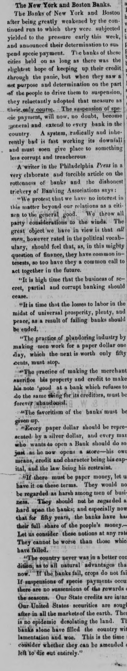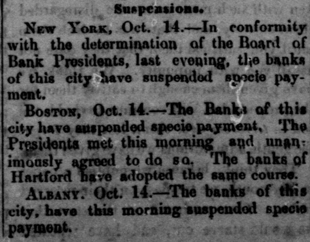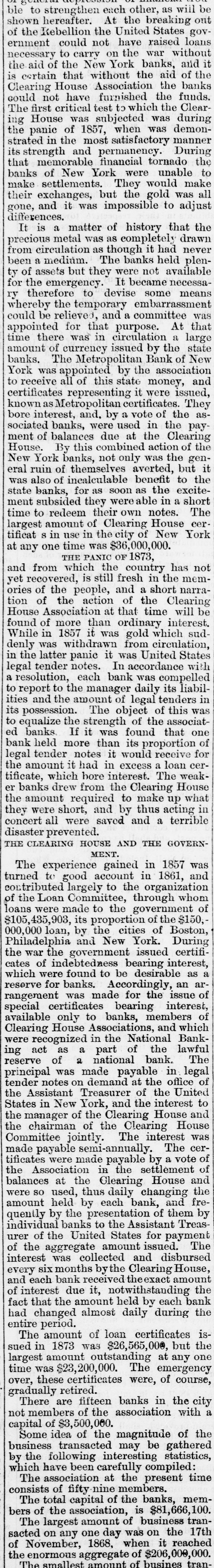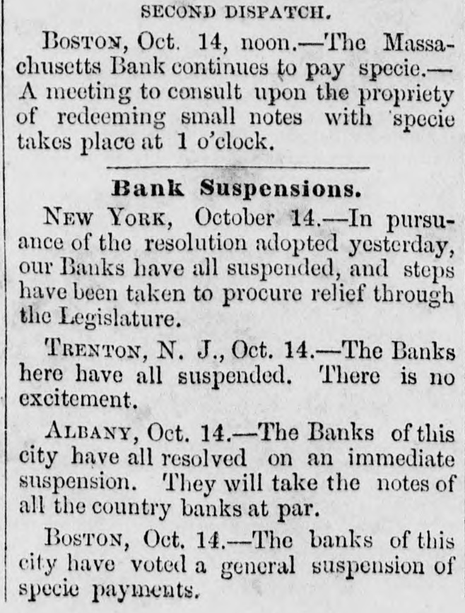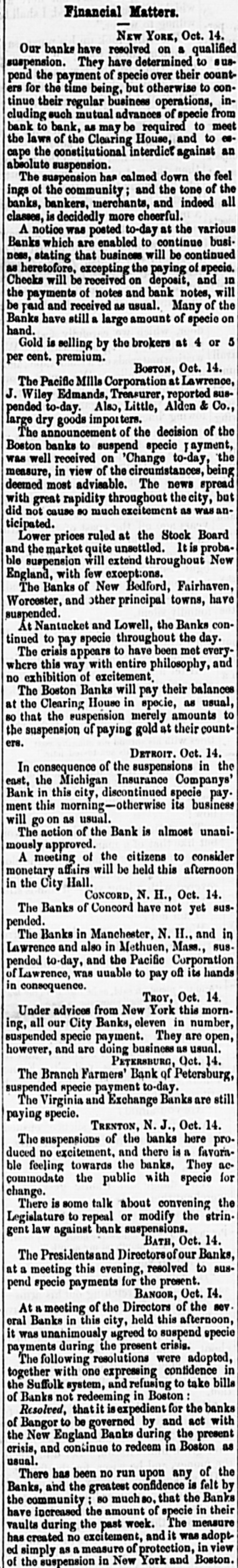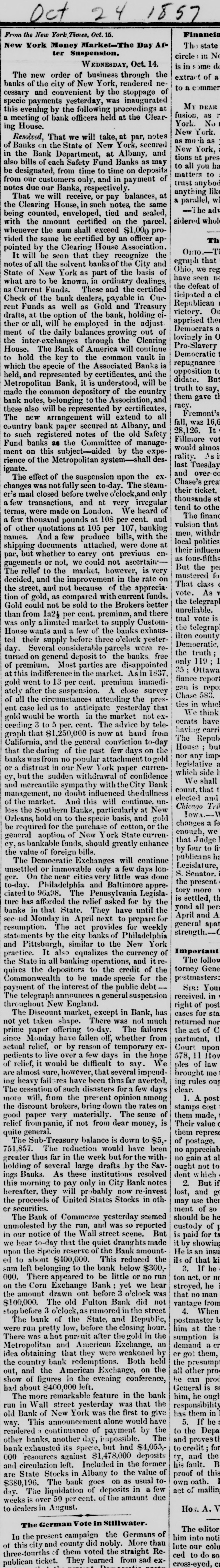 Oct Financia the New York Times, Oct. 15. The state York Money Market-The Day After Suspension. circle III No WEDNESDAY, Oct. 14. is ome de new order of business through the extract of a of the city of New York, rendered neto ommer and convenient by the stoppage of payments yesterday, was inaugurated My DEAR evening by the following proceedings at - fusion, as of bank officers held at the Clear"N THE House. New York. esolved, That we will take, at par, notes as me -h as on the State of New York, secured New York, Bank Department, at Albany, and tions at pres of each Safety Fund Banks as may to all you ha matters to esignated, from time to time on deposits of our customers only, and in payment trust any bod due our Banks, respectively anything like we will receive, or pay balances, at a parallel, W Clearing House, in such notes, the same adv counted, enveloped, tied and sealed, sidered whol the amount certified on the parcel. never the sum shall exceed $1,000 000 proTh the same be certified by an officer apby the Clearing House Association OHIO.-T will be seen that they recognize the egraph that of all the solvent banks of the City and Ohio, we reg of New York as part of the basis of have seen no are to be known. in ordinary dealings, the defeat of Funds. These and the certified ticipated cl of the bank dealers, payable in CurRepublican Funds as well as Gold and Treasury O victory. at the option of the bank, holding eiapprised the or all, will be employed in the adjust Democrats a of the daily balances growing out of lovingly in 0 inter exchanges through the Clearing Pro-Slavery The Bank of America will continue Democratic the key to the common vault in repugnance h the specie of the Associated Banks is opposition to and represented by certificates, and the didate. But opolitan Bank, it is understood, will be truth to say, the common depository of the country them gave tl notes. belonging to the Association, and racy also will be represented by certificates, Fremont's new arrangement will extend to all fall, was 16,6 bank paper secured at Albany, and 28,126. 28. It registered notes of the old Safety 10A banks as the Committee of managewould almos on this subject-aided by the experality. ^s of the Metropolitan system- shall deslast Tuesday and overeffect of the suspension upon the ex Chase's grea was not fully seen to-day. The steamtheir ticket. closed before twelve o'clock.and only thousands st transactions, and at very irregular tend to othe were made on London. We heard of The finance thousand pounds at 108 per cent. and vulsion that quotations at 105 per 107, banking men. withdr And few produce bills, with the local polities documents attached, were done at their influen but whether to carry out previous enas four-fifths ments or not, we could not ascertainBut the pe rellef to the market, however, is very mustered for and the improvement in the rate on That class and not because of the apprecia vote. As \ of gold, as compared with current funds. the telegrap could not be sold to the Brokers better unreliable. from 1a21 per cent. premium, and there tual vote is a limited market to supply Customthe telegrap wants and a few of the banks exhausilton county their supply before three b'clock yesterDemocratic, Several considerable parcels were rethe truth on general deposit to the banks free 611 Spuo remium. Most parties are disappointed 35; Ottawa indifference in the market. As 1837, fiance repor went to 13 per cent. premium immedigan is repo after the suspension. A close survey Chase 583. the circumstances attending the presties in which led us to anticipate yesterday that We think would be worth in the market not exocrats have 3 to 5 per. cent. The advice by telehaving carri that $1,250,000 is now at hand from The Repub fornia, and the general conviction to-day House bu the daring of the past few days on the nor any imp was from no popular attachment to gold legislative distrust in our New York paper currenwhich side 1 the sudden withdrawal of confidence We shall mercantile sympa thy with the City Bank count. that agement, no doubt influenced thedullness elected and market. And this will continue, unML Chicago the Southern Banks, particularly at New IOWA hold on to the specie basis, and gold changes fe equired for the purchase of cotton, or the enough, we aoption of New York State currenthat Judge bankable funds, should greatly enhance by four to fi value of foreign bills. publicans h: Democratic Exchanges will continue Legislature, ttled or immovable only a few days lonSenator, S. On the near cities little was done the present Philadelphia and Baltimore appretory more to 96a98. The Pennsylvania Legislais settled, tl has afforded the relief asked for by the yond all per in that State. They have until the April and A Monday in April next to prepare for general apa mption. The act provides for weekly strength.ments by the city banks of Philadelphia Pittsburgh, similar to the New York Important also It the jo currency equalizes The follow State in all banking operations, and it retorney Gene the depositors to the credit of the postmasters monwealth to be made specie for the SIR: You of the interest of the public debt received. in telegraph announces a general suspension aghout New England. right of post cases for sta Discount market, except in Bank, has returned not taken shape. There was not much the act of 0 paper offering to day. The failures partment, Monday have fallen off, whether from Court upon relief, or by reason of temporary exto live over a few days in the hope 578, 11 How it would be difficult to say. We ples of law brought me sure, however, that several impendfail res have been thus far averted, ing rules ou clear. cessation of such disasters fora few days A post will, from the present opinion atnong liscount brokers, bring down the rates on stamps cost them made, paper very materially. The sense of Their value from panic, if not from dear money, is general. them repres of posta